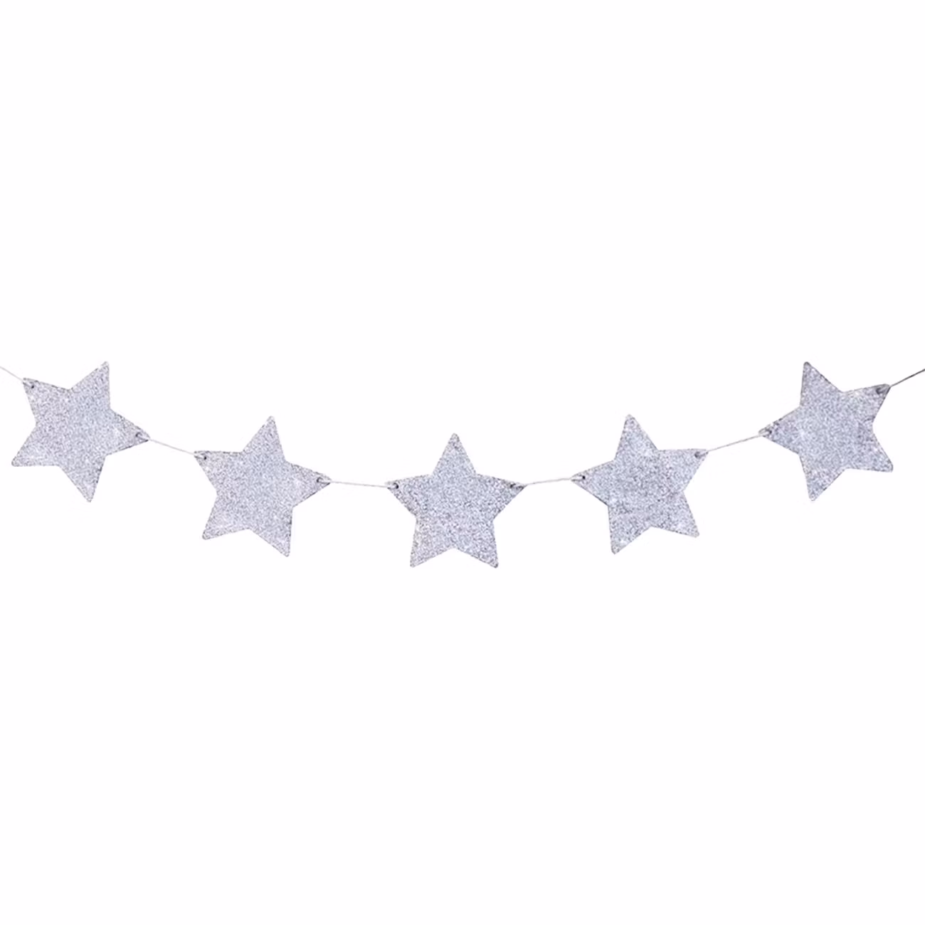Girlang Glitterstjärnor Silver består av en superfin girlang med stora, glittriga stjärnor i silver som du enkelt hänger upp på passande ställe. Girlangen passar lika bra som nyårsdekoration och julpynt som till stjärnfesten!