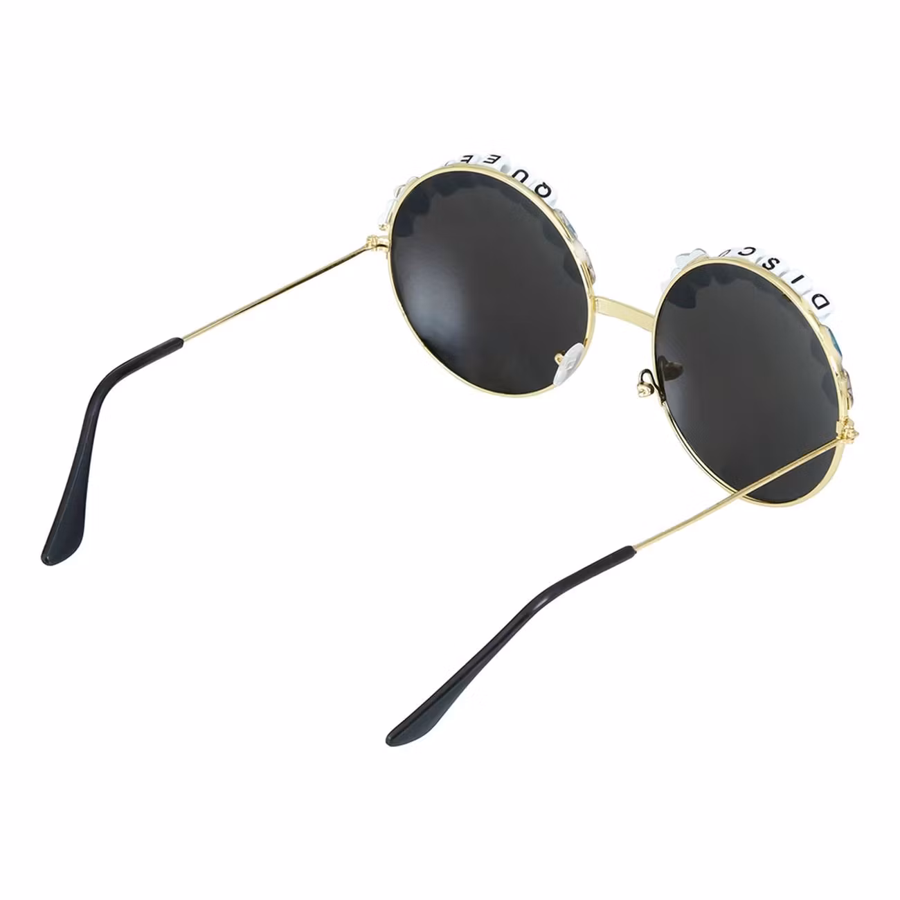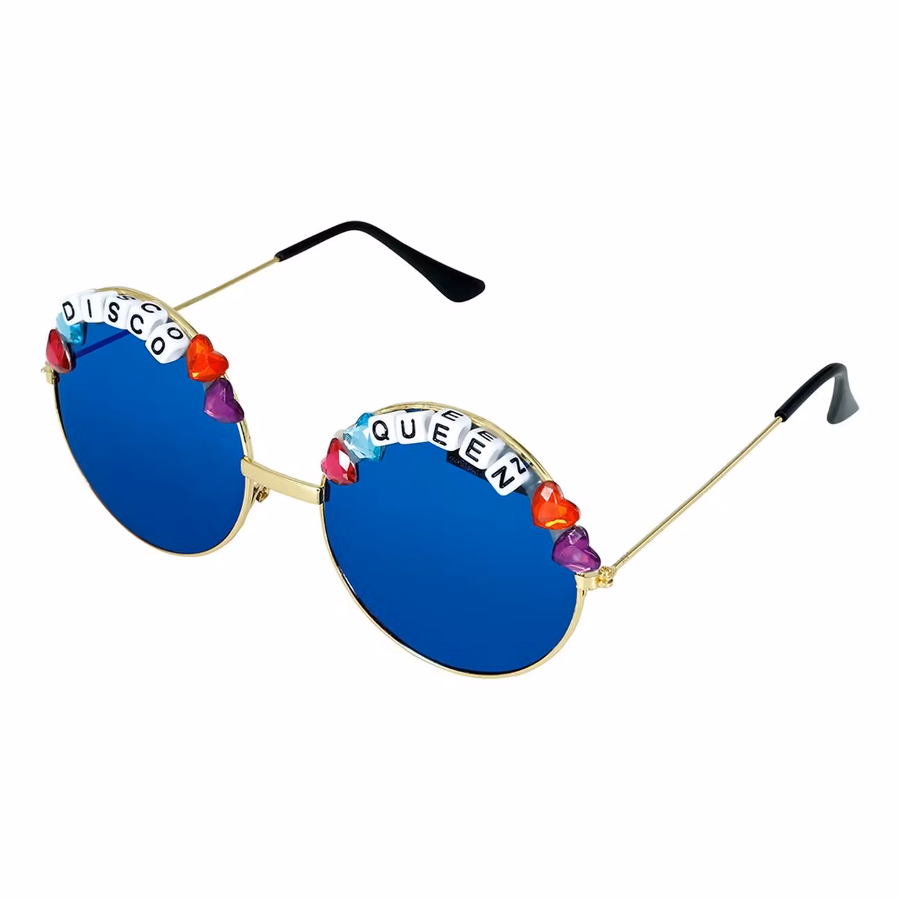 Glasögon Disco Queen har runda blåtonade linser med guldfärgade bågar, dekorerade med små färgglada hjärtformade stenar och bokstavspärlor som bildar texten Disco Queen.