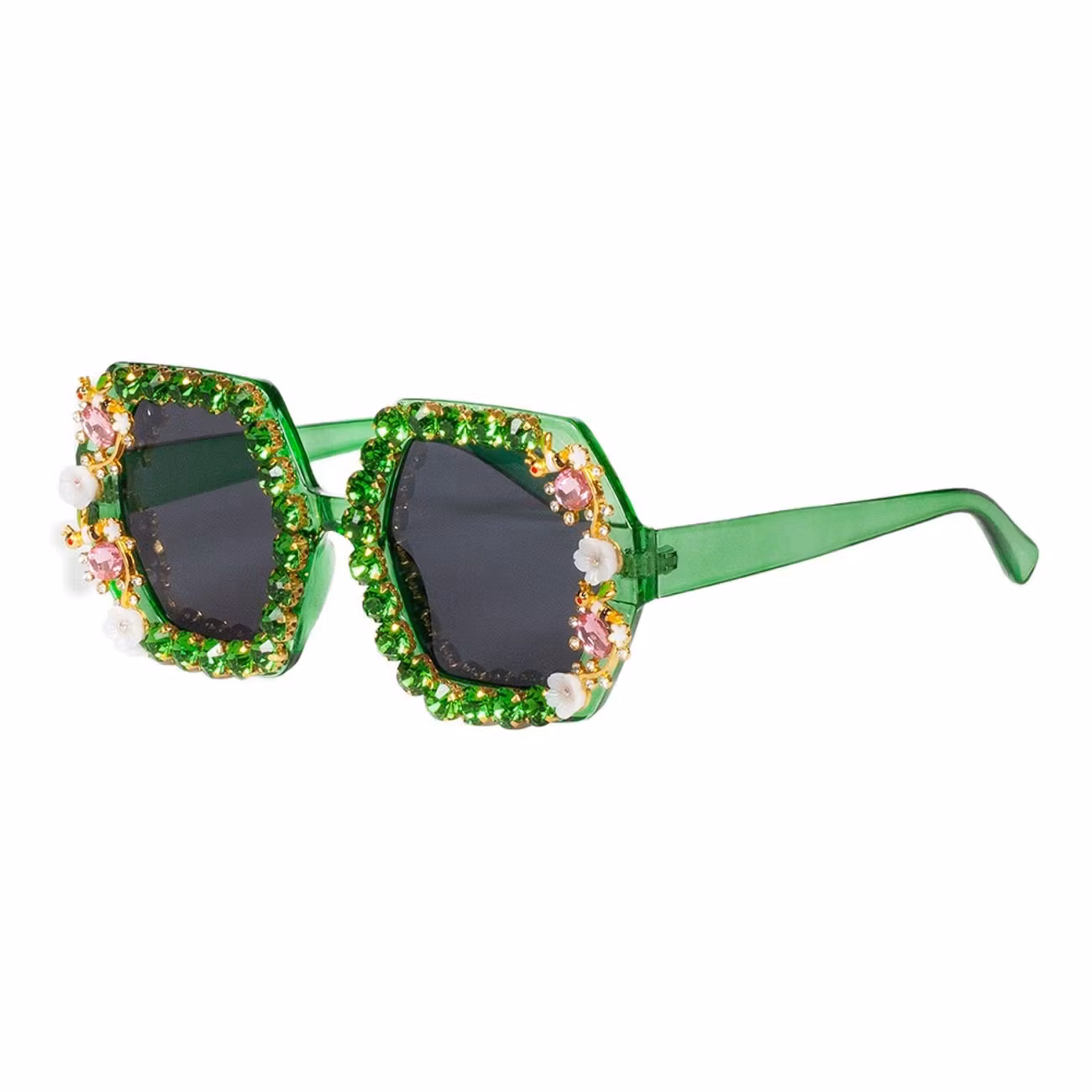 Glasögon Flowers med Pärlor Grön har en kantig retroform, dekorerade med glittriga stenar, små vita blommor och rosa strasstenar med gulddetaljer. Ett färgstarkt och maxat statement!