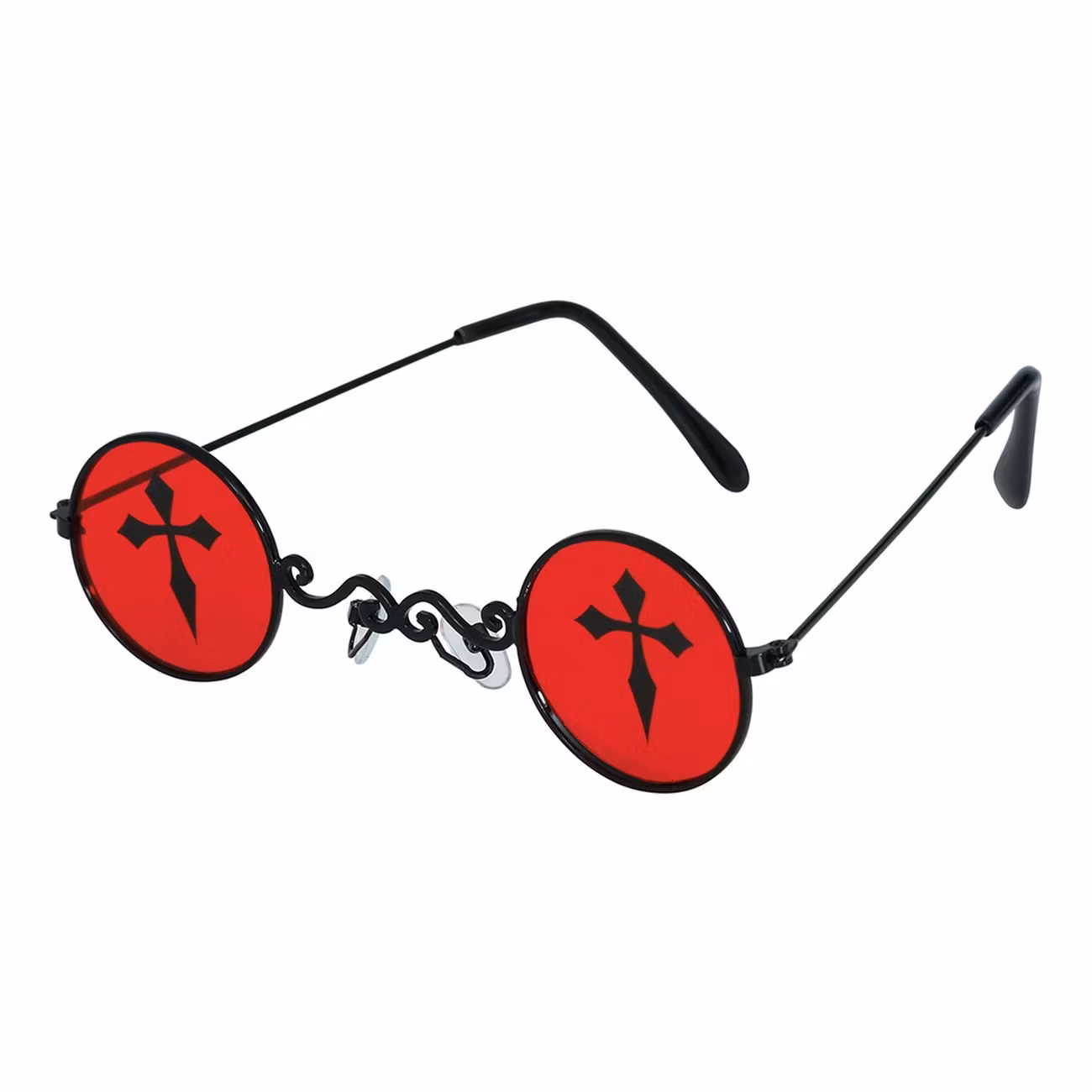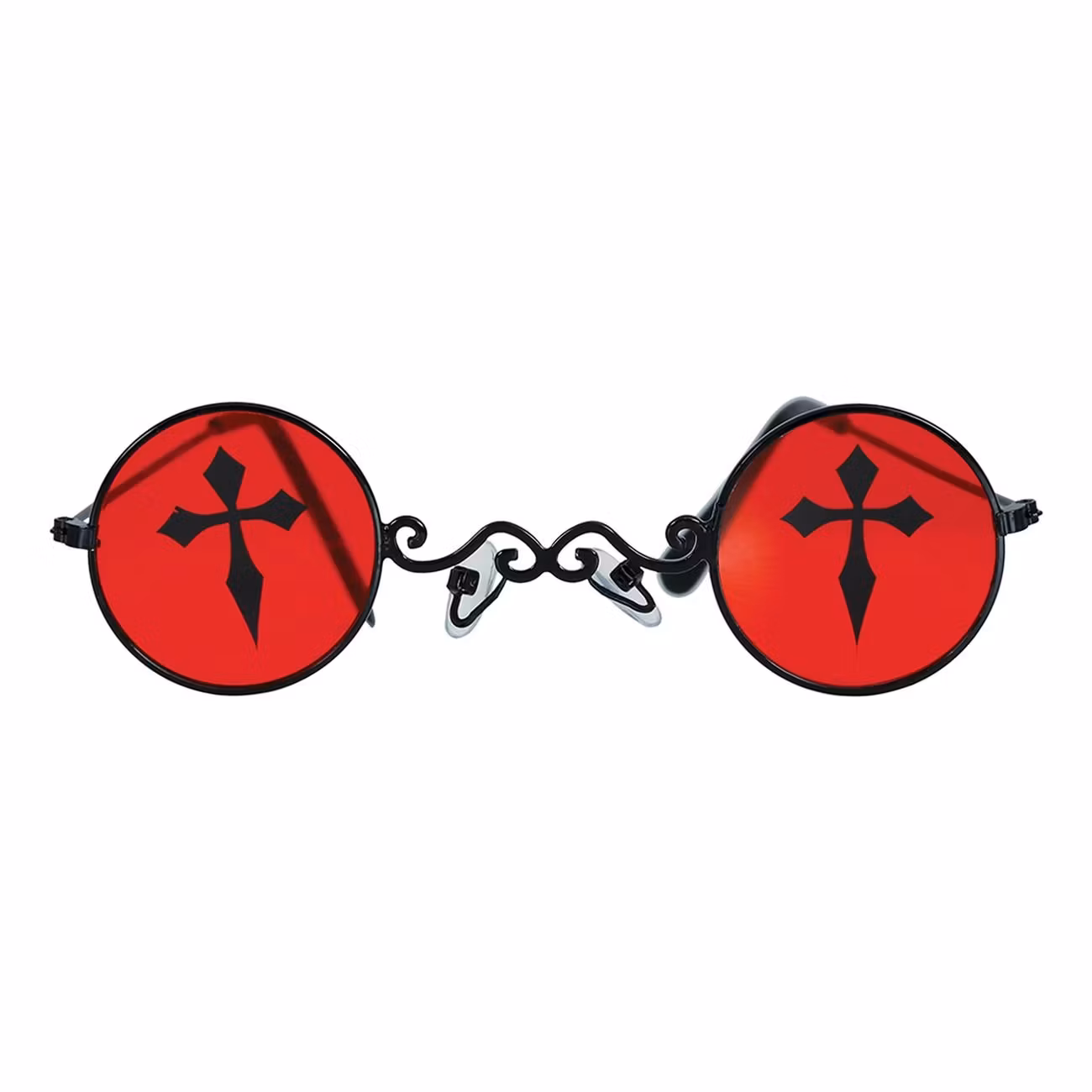 Glasögon Gothic kommer med svarta bågar, runda och röda glas med korssymboler som passar perfekt när du ska klä ut dig till exempelvis en vampyr (eller vampyrjägare).