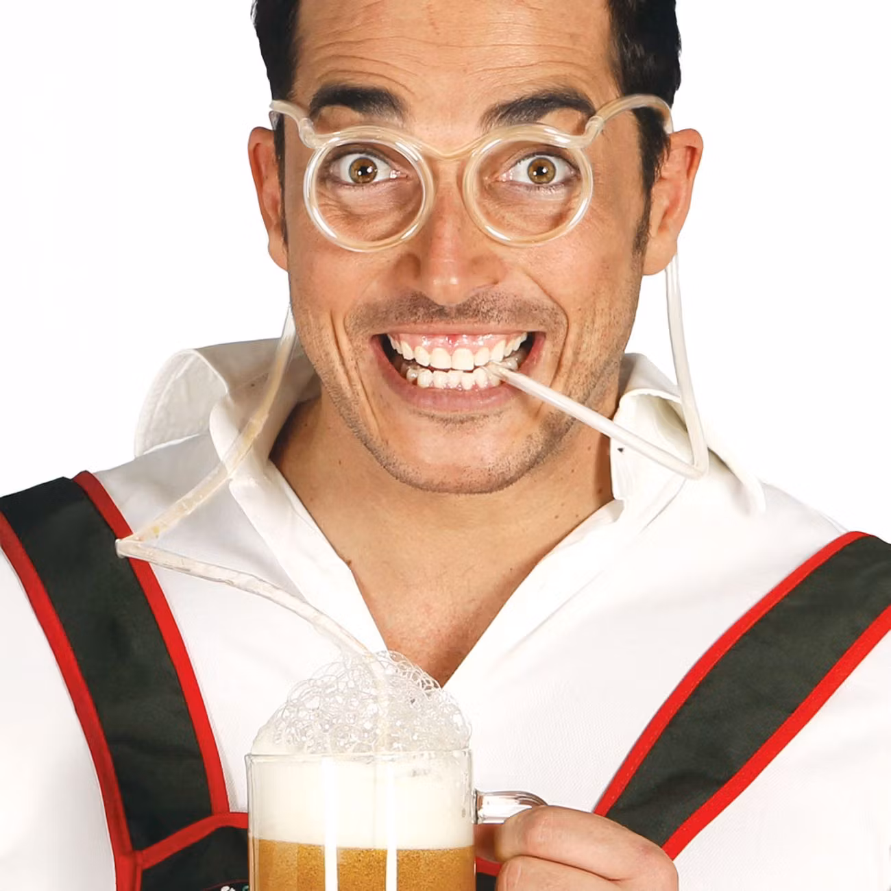 Glasögon Sugrör består av ett transparent jättelångt sugrör som är formade som ett par glasögon. Placera den på näsan och runt öronen, och stoppa sedan ena änden i glaset och den andra änden i munnen. Ett måste till Oktoberfest, svensexan, möhippan eller ölfestivalen!