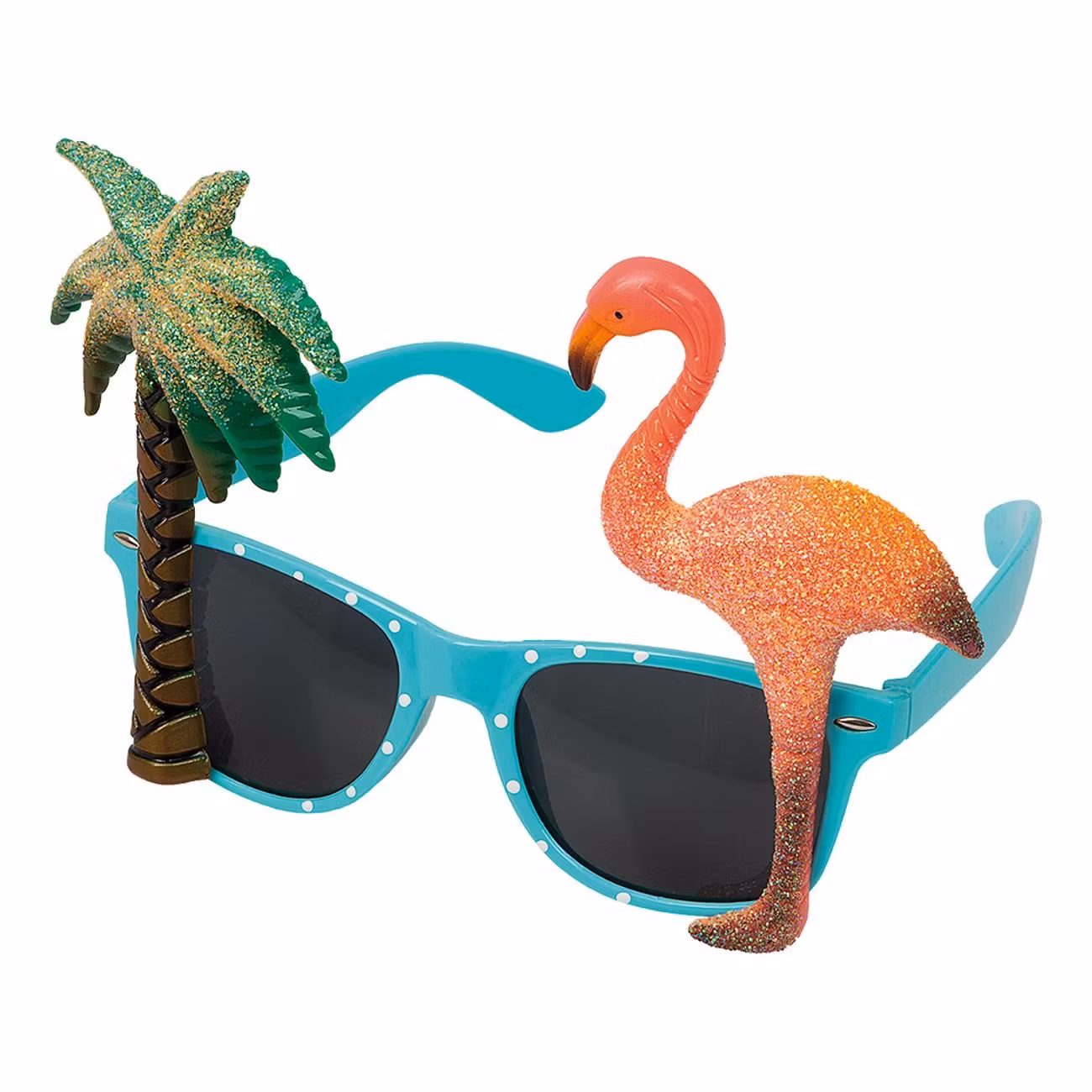 De tropiska glasögonen kommer med en obligatorisk palm och flamingo som sitter på varsitt öga - båda fyllda med glada färger och glitter. Glasögonramen är i blått och med trevliga små vita prickar.