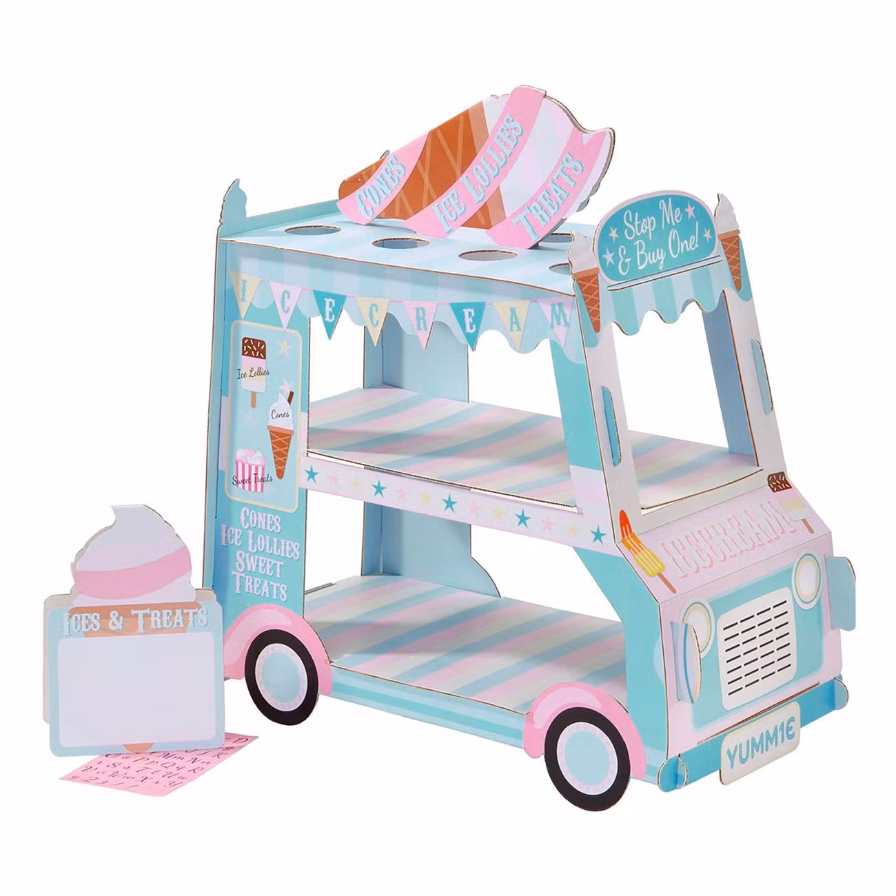 Glassbil Godisställ kommer i form av en mysig glassbil i lekfull design med tre våningar där du kan placera kakor, godis, snacks och annat smaskigt (dock ej riktiga glasstrutar). Medföljer gör tolv stycken realistiska pappersstrutar som du kan fylla med valfritt godis och placera på toppen. Du får även ett gäng fina stickers samt en liten tjusig skylt som du kan skriva nåt skojsigt på. Stället passar lika bra till barnkalaset som till baby showern, bröllopet eller möhippan.