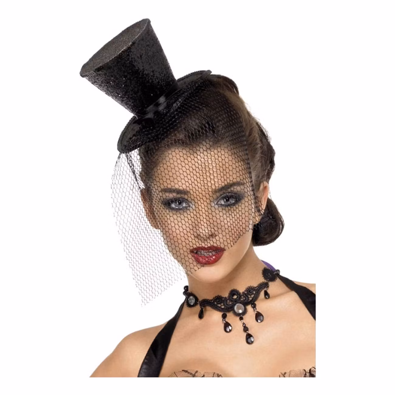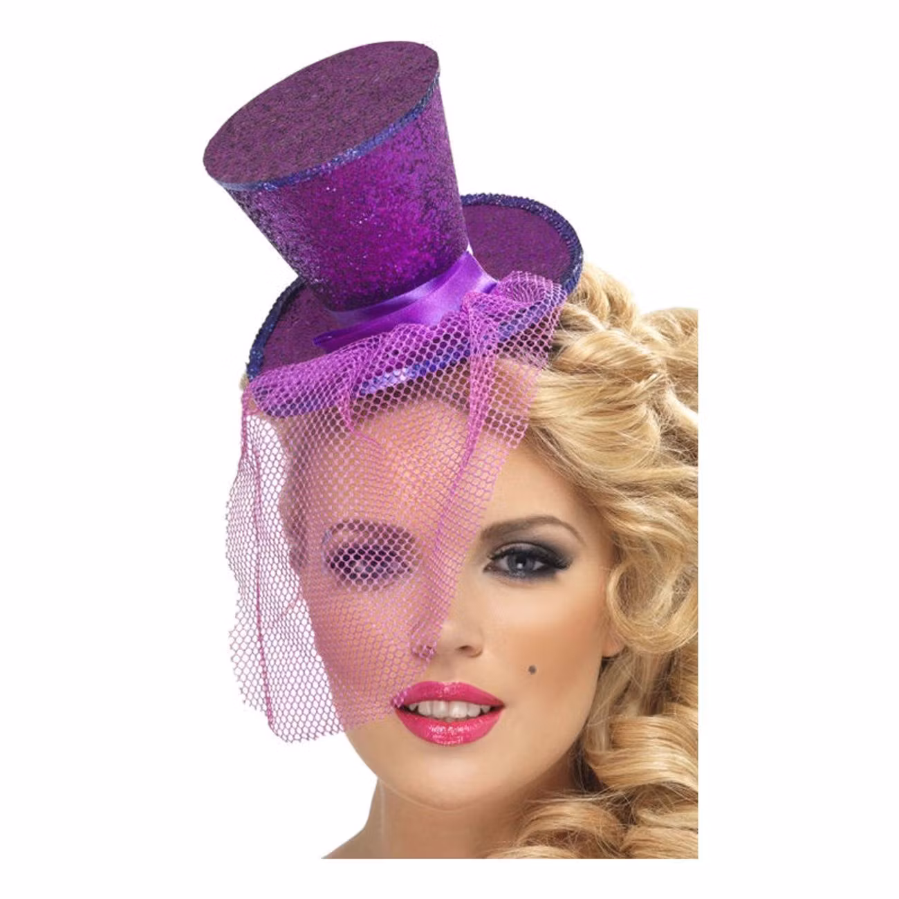Glittrig minihatt med flor. Hatten fästs enkelt i håret med medföljande diadem. Välj mellan flera olika färger. One size (vuxenstorlek).