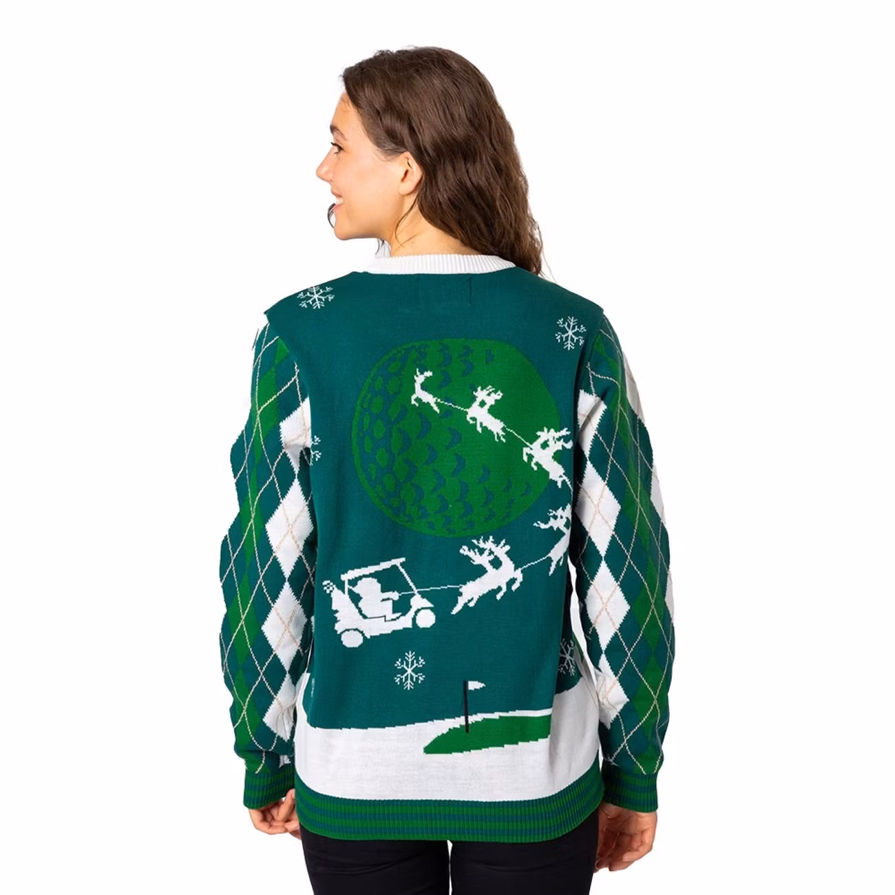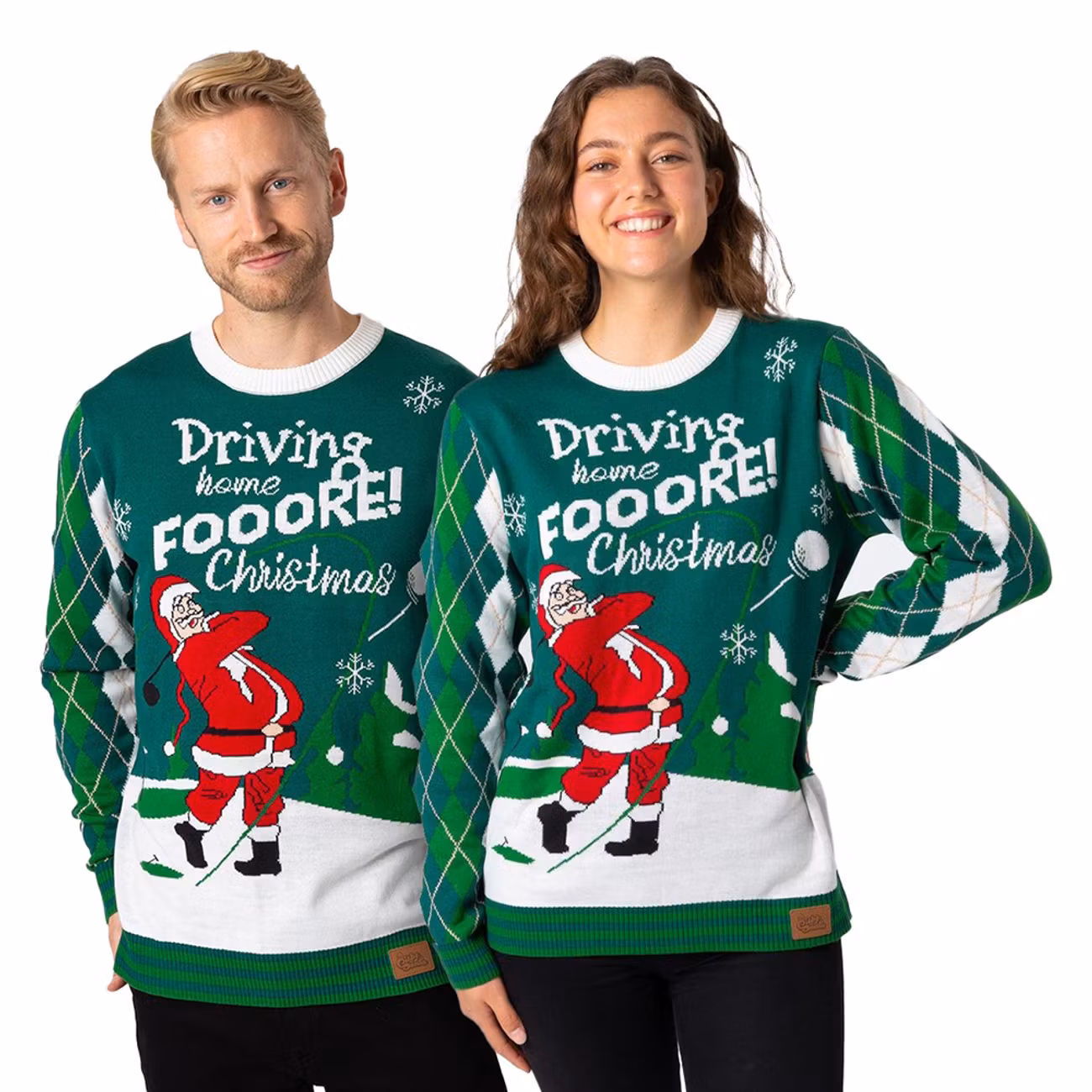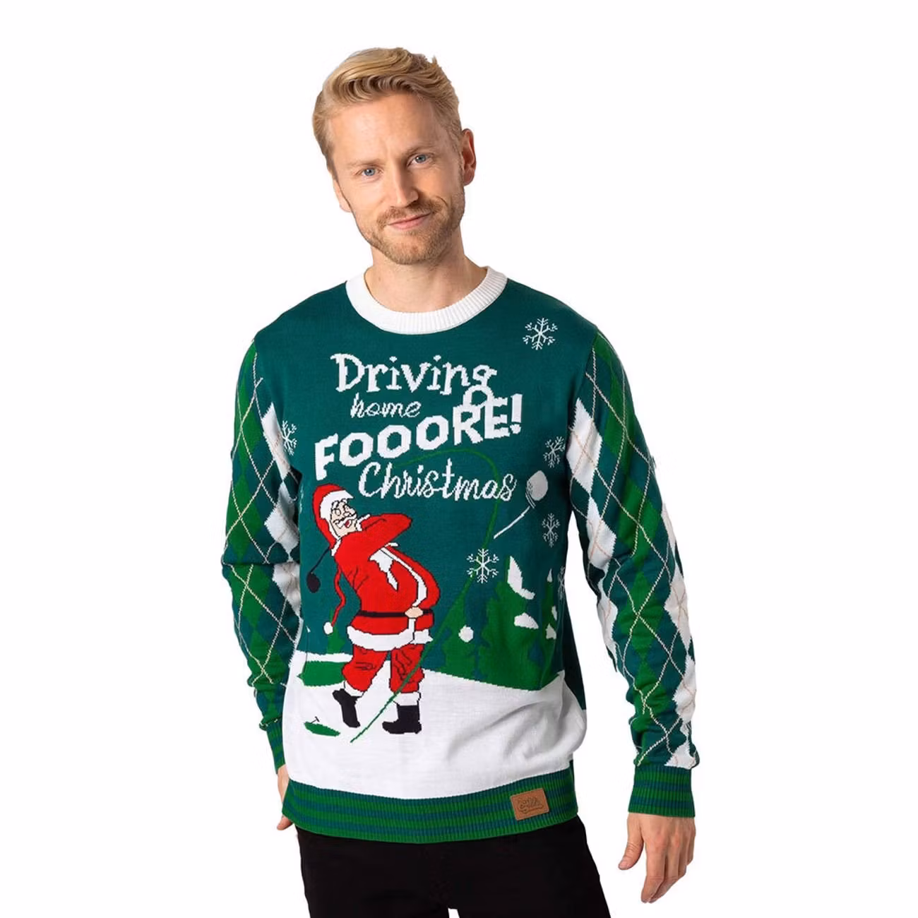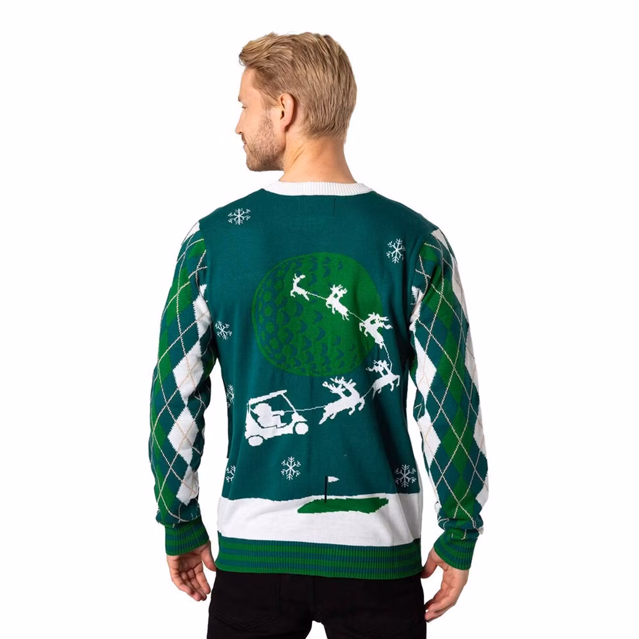 Golfaren Jultröja är en otroligt rolig och snygg jultröja för dig med humor. Tröjan kommer i sex olika storlekar för vuxna och är stickad i högkvalitativt garn. Tröjan kommer i en blå färg med ett stort motiv av jultomten som svingar en golfklubba tillsammans med texten: "Driving home fooore christmas". Tja, spelar man golf, då fattar man! På ryggen finns motivet av en green tillsammans med tomten som åker släde i sin golfbil, och månen är en enda stor golfboll. En rätt mäktig tröja kan man väl säga? Medföljer gör dessutom en greenlagare tillsammans med en bollmarkör i metall.