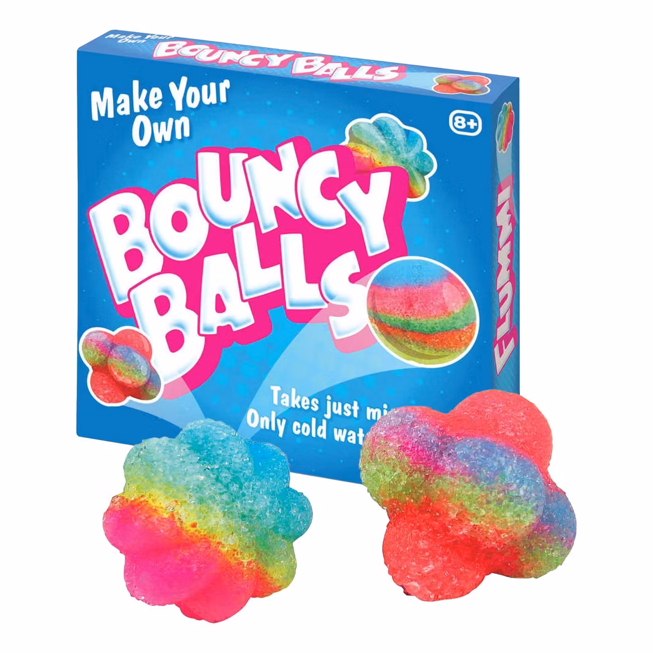 Gör Dina Egna Studsbollar är ett kit som innehåller plastgranulat som enkelt blandas med vatten för att förvandlas till studsbollar. Forma bollarna fritt i udda former och färgkombinationer, applicera kallt vatten, vänta två minuter, studsa!