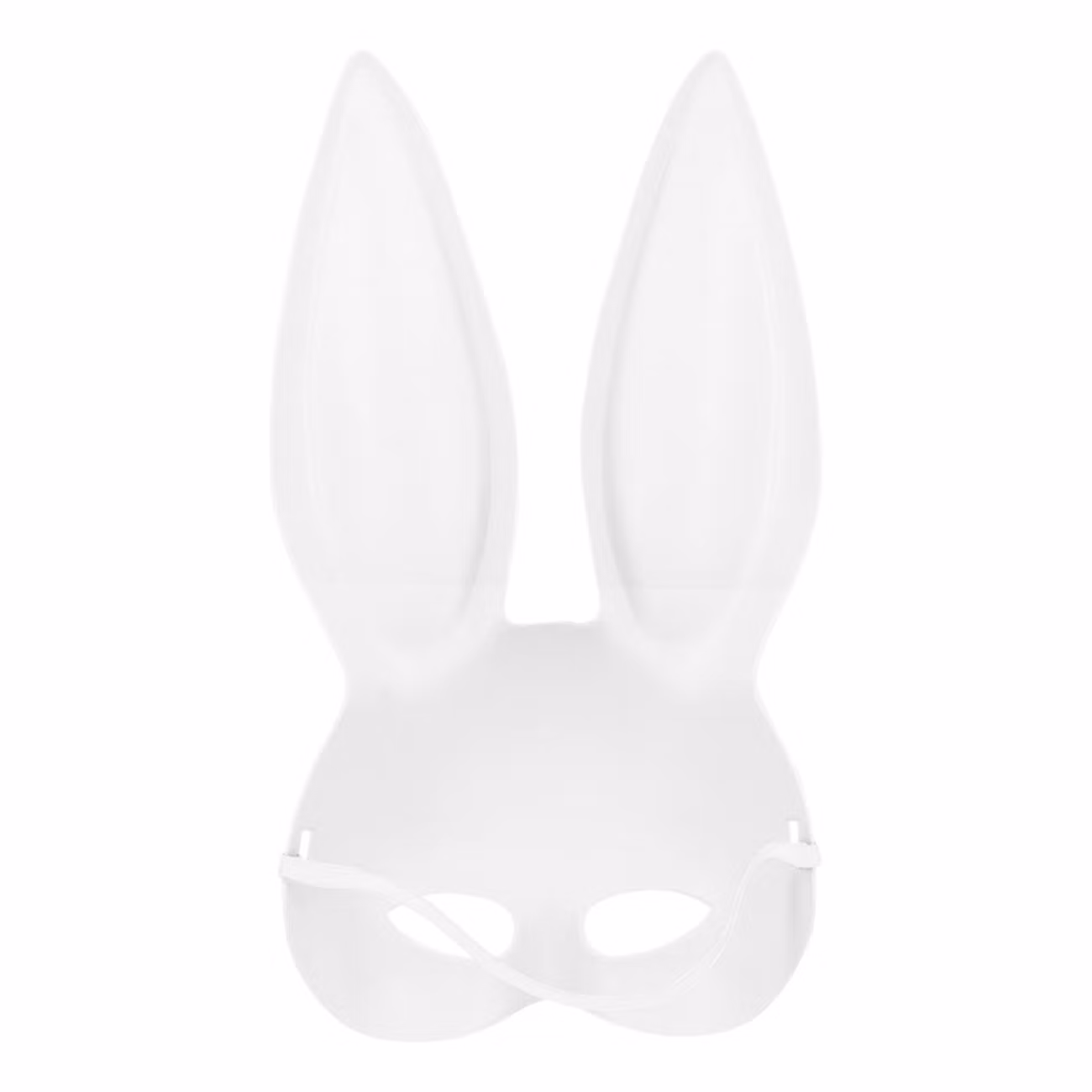 Halvmask Kanin Vit är en mask med kaninöron som täcker halva ansiktet, med hål för ögonen. Kommer i en storlek för vuxna och passar de flesta tack vare det elastiska bandet som håller fast masken.