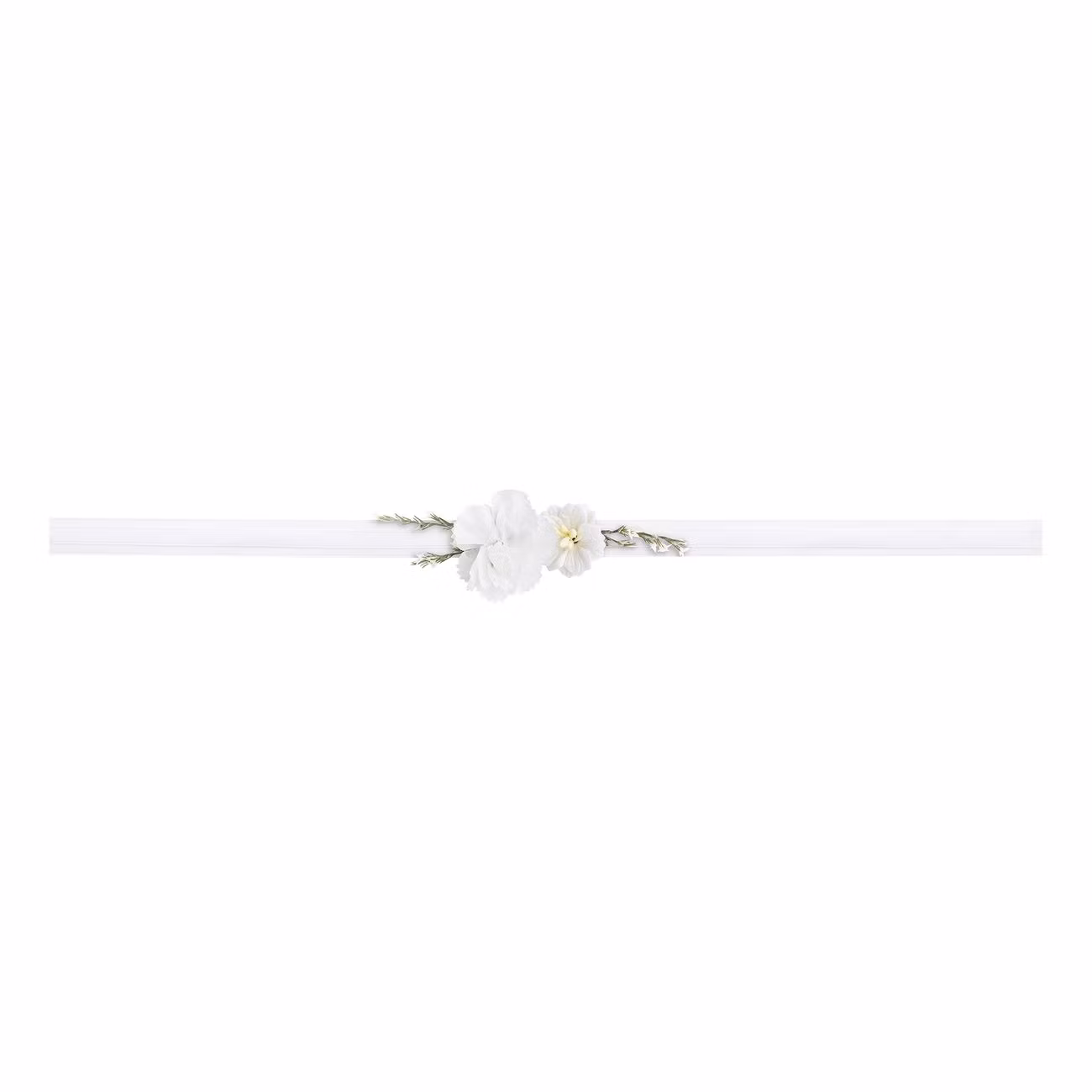Handledskorsage Vita Blommor består av ett elastiskt, tunt band dekorerat med två små, vita konstblommor i mitten. Blommorna kompletteras av några eleganta, guldfärgade blad som ger ett romantiskt och sofistikerat uttryck.