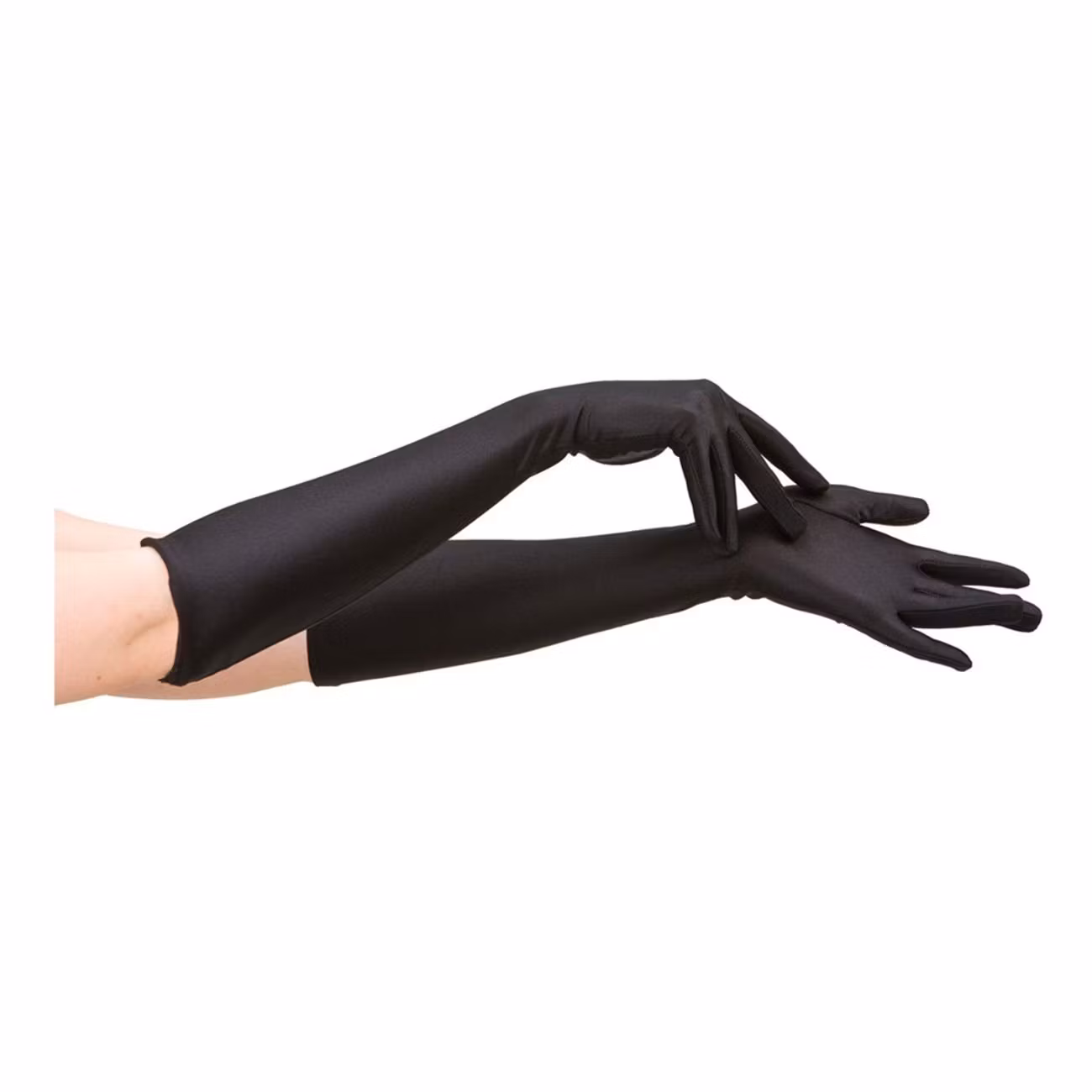 Handskar Långa Svarta inkluderar två svarta handskar som går upp till armbågarna. Handskarna är tillverkade i polyester och finns i en storlek som passar vuxna. De är 39 cm långa.