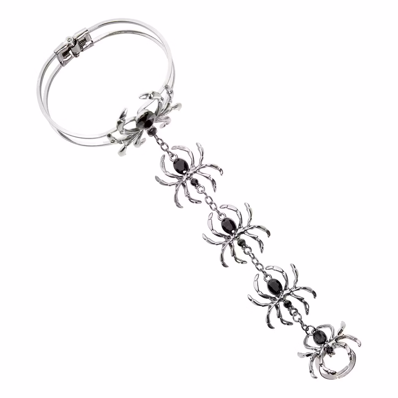 Handsmycke i Metall Spindlar är ett armband som består av silverfärgade länkar föreställande spindlar fästs mellan finger och handled. Handsmycket/armbandet passar utmärkt som accessoar när du exempelvis skall klä ut dig till vampyr eller häxa till halloween.