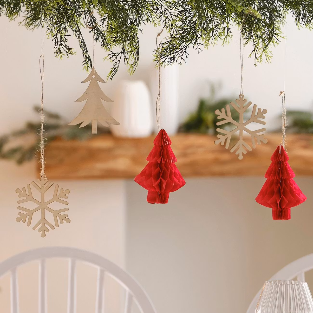 Hängande Juldekoration Gran & Snöflinga inkluderar juliga små dekorationer i form av snöflingor och julgranar i trä och vackra honeycombsgranar i rött. Häng upp de i granen eller fäst de över middagsbordet för en julig känsla.