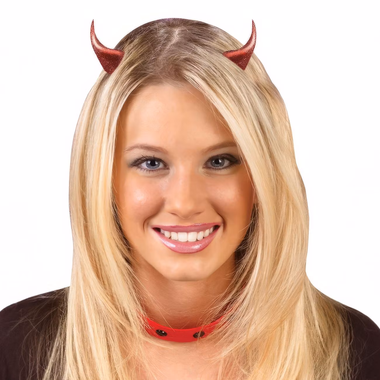Hårklämmor Djävulshorn inkluderar två stycken små röda horn med clips på som du enkelt sätter fast i ditt hår. Det är bara hårklämmorna med djävulshornen som ingår, inget annat som syns på bilden.