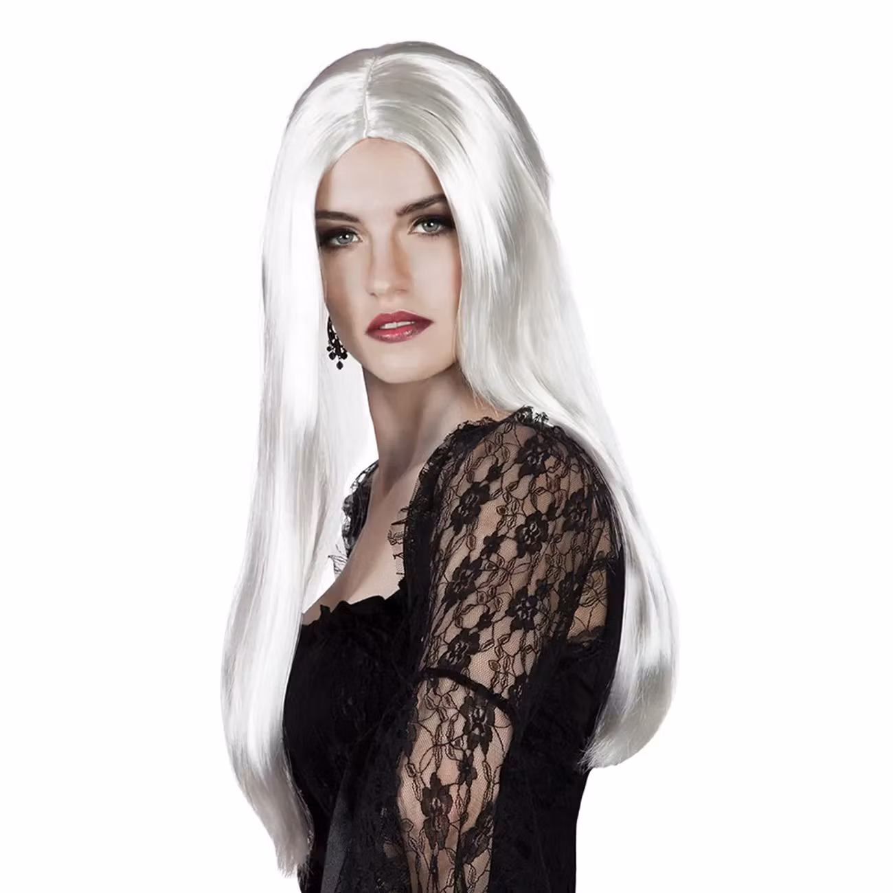 Häxa Vit Peruk är en vackert glansig vit peruk med mittbena och långt vackert fall på håret.