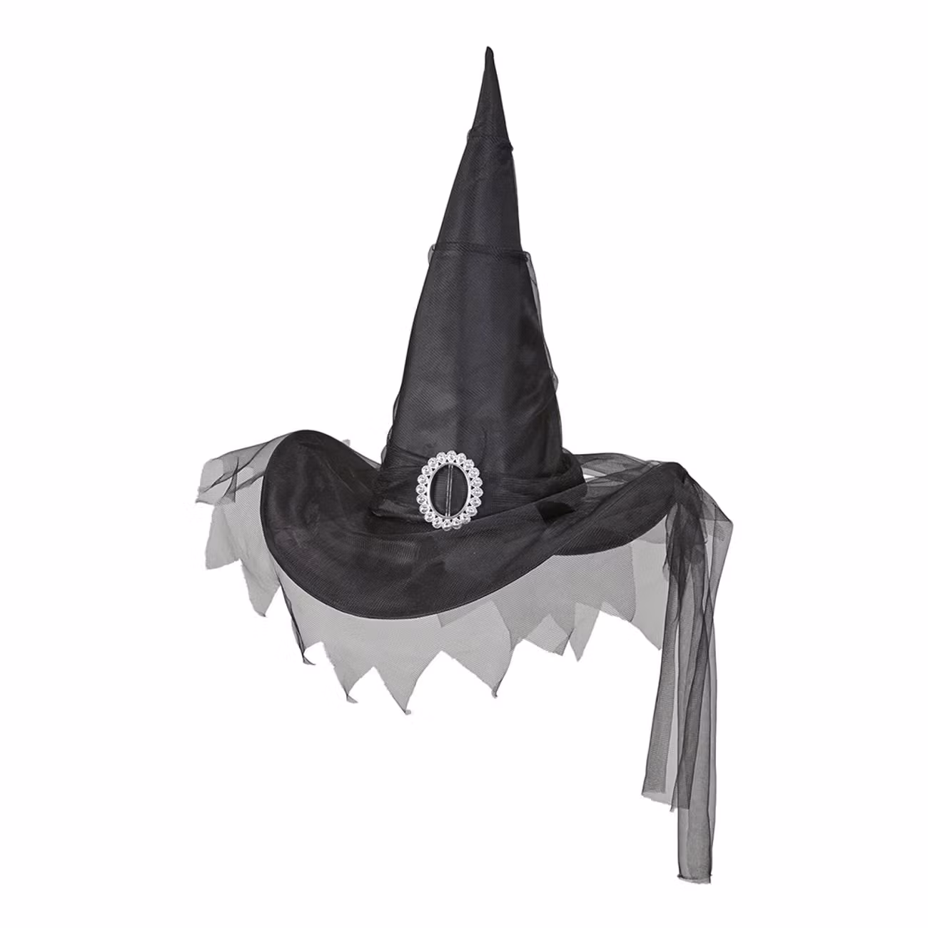 Häxhatt svart med spänne framtill och draperat tylltyg hängandes ner på sidorna. Ett måste för alla seriösa häxor där ute!