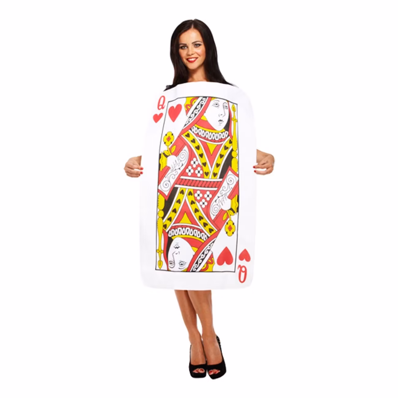 Rolig utstyrsel för dig som blivit bjuden på maskerad men inte riktigt vet vad du ska ha på dig. Bli som hämtad från en kortlek i denna enkla dräkt föreställandes ett stort spelkort med hjärter dam!