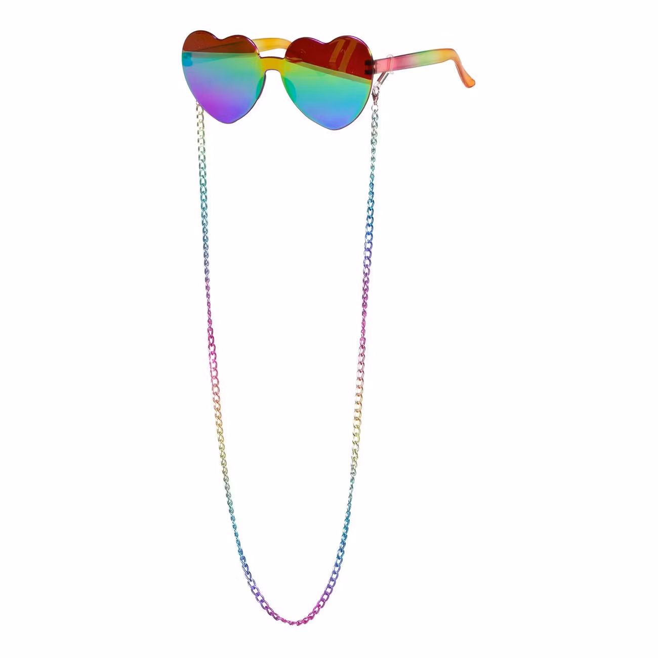 Hjärtglasögon med Kedja är ett par hjärtformade glasögon med flerfärgat spegelglas och en tillhörande kedja i matchande färg. Perfekt till pride, schlagerfesten eller festivalen!