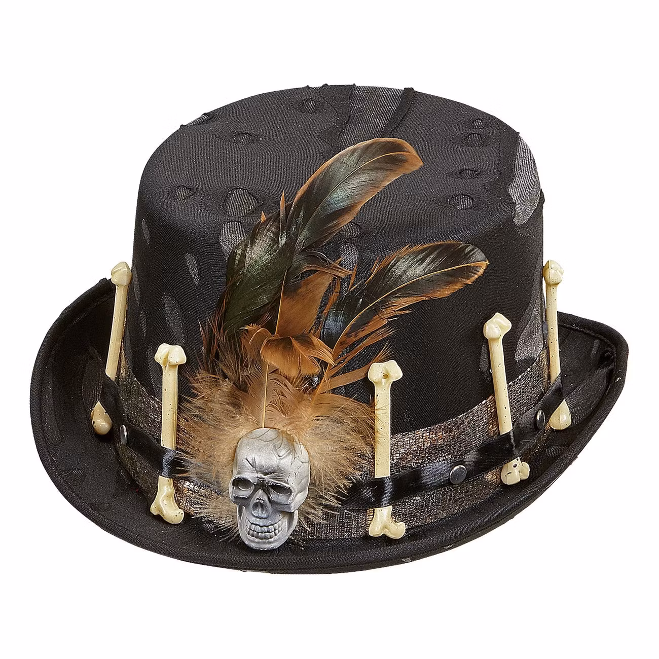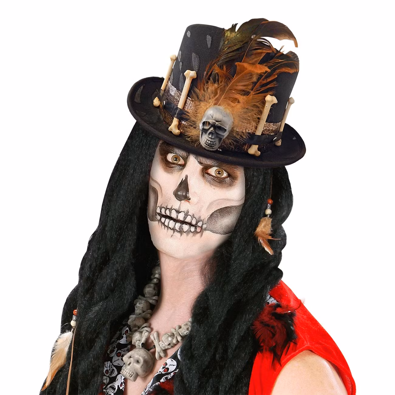 Höghatt Häxdoktor är en svart höghatt som kommer dekorerad med benknotor, en dödskalle och äkta fjädrar. En utmärkt huvudbonad för en creepy häxdoktor-look helt enkelt!