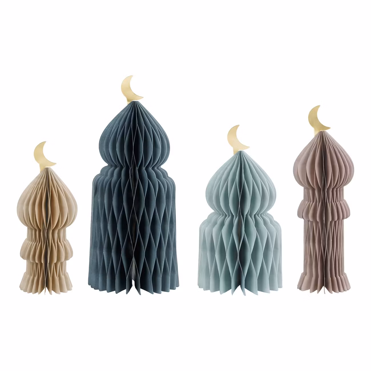 Honeycombs Eid Mubarak består av fyra vackra pappersfigurer formade som moskékupoler. De är tillverkade i en mjuk, veckad pappersdesign som ger dem ett luftigt och elegant utseende. Matcha tillsammans med ytterligare dekorationer med Eid Mubarak-tema för att få en extra festlig känsla!