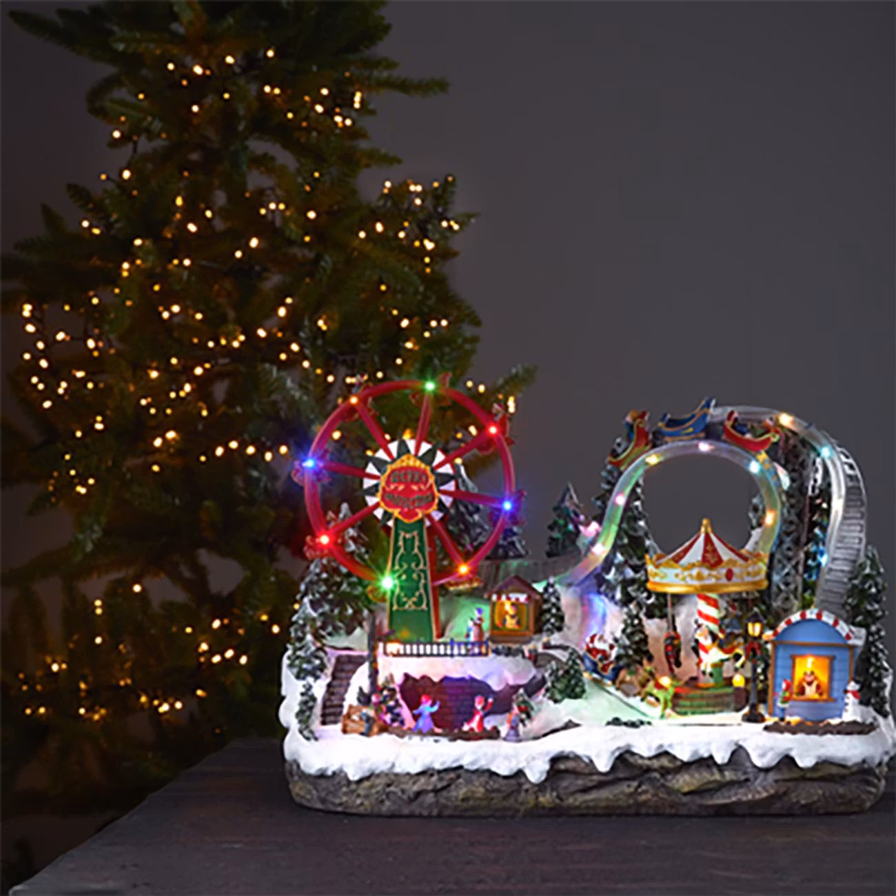 Välkommen till det juligaste tivolit i stan! Här breder snön ut sig som ett täcke över marken, men inte stoppar det byborna från att åka pariserjul och berg- och dalbana. Med det här vackra vinterlandskapet på hyllan fylls ditt hem automatiskt med maxat julemys och massvis med fröjd!