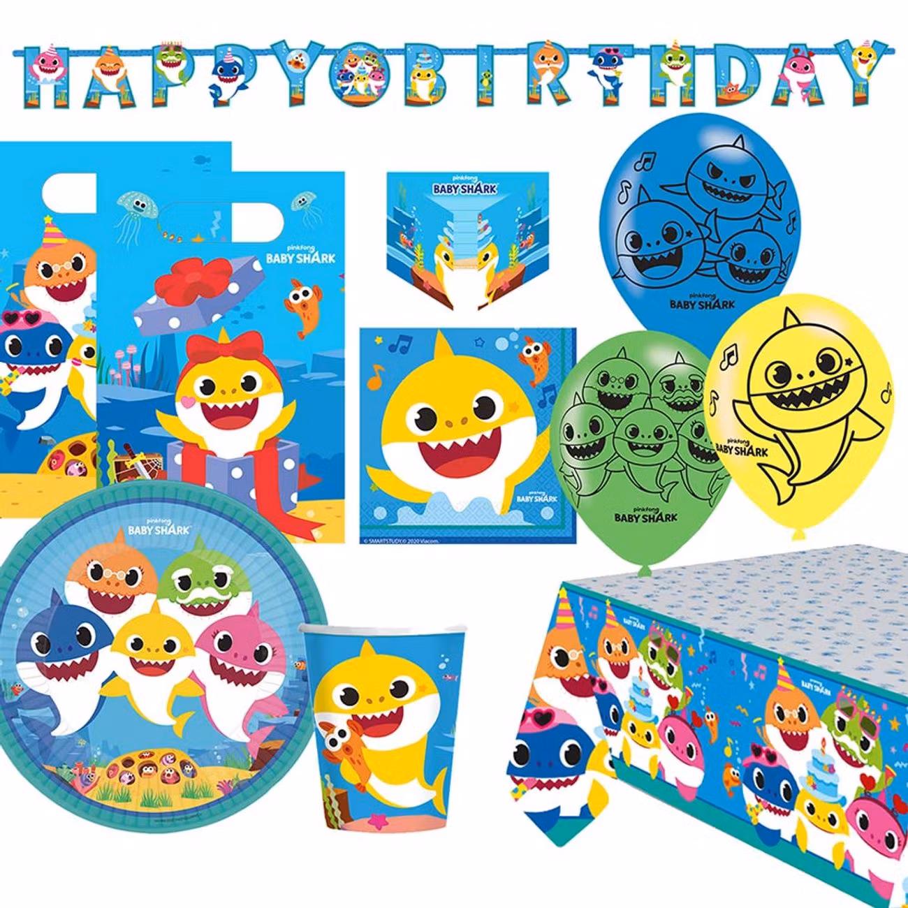 Kalaspaket Baby Shark är ett utmärkt kit perfekt för födelsedagskalaset i gulligt Baby Shark-tema. Paketet innehåller dukningsprylar såsom tallrikar, servetter och muggar samt dekorationer i form av en Happy Birthday-girlang, ballonger, bordsduk och till och med kalaspåsar och inbjudningskort.