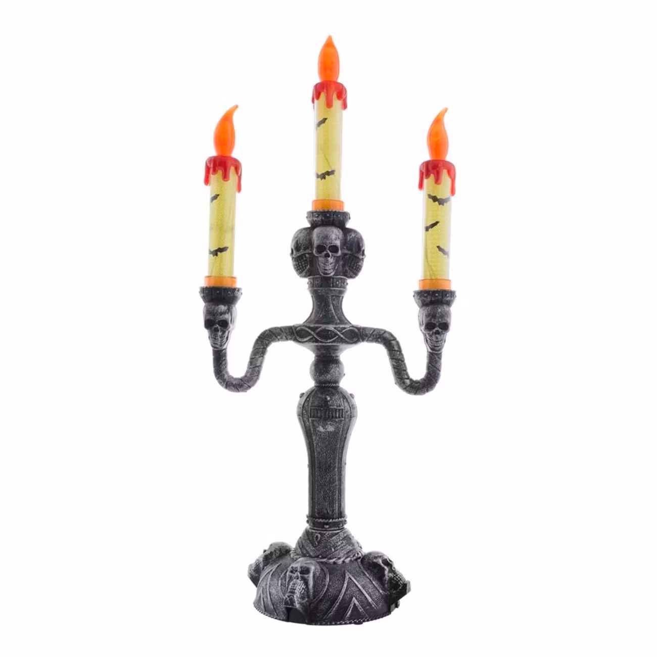 Kandelaber Döskallar är en kandelaber dekorerad med döskallar. Kandelabern har tre ljus som drivs med tre AA-batterier. Batterier ingår inte. På ljusstaken finns en on/off-knapp. En bruksanvisning på engelska medföljer. Kandelabern är tillverkad i plast och den är 12 x 18 x 40 cm stor.