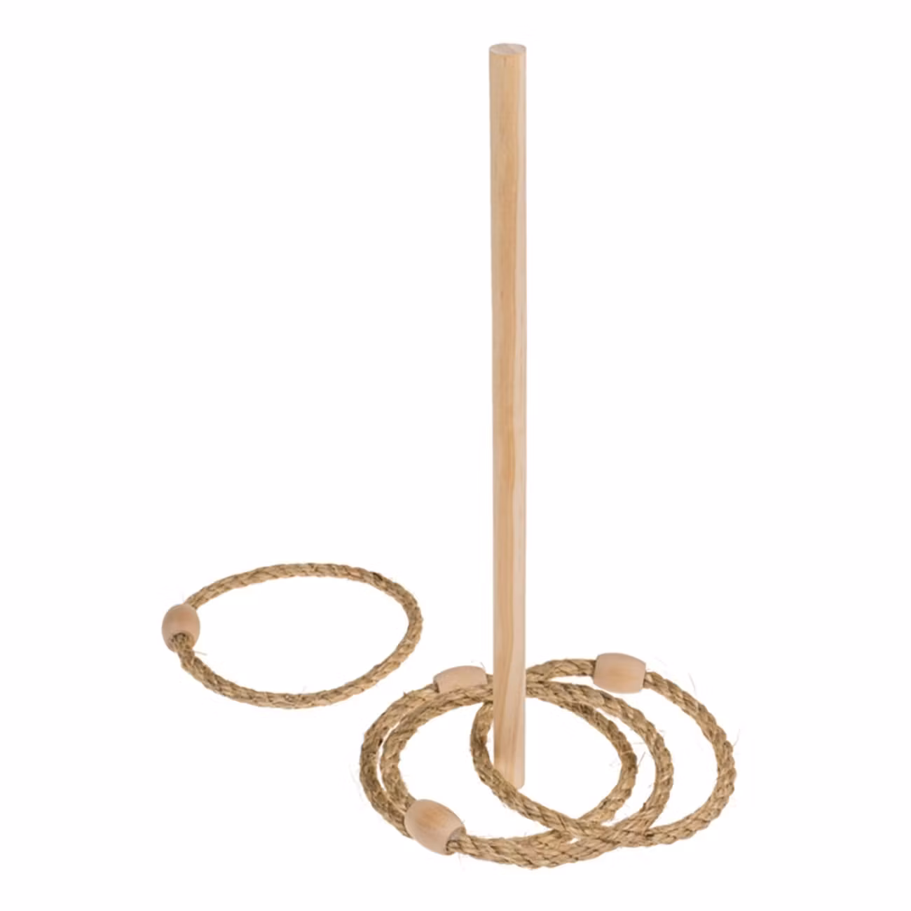Kasta Ring Spel i Trä inkluderar en träpinne och fyra ringar. Träpinnen sätter du enkelt fast i marken, sen är det bara att turas om att kasta ringarna och se vem som kan träffa flest. Spelet passar bäst att spela utomhus.