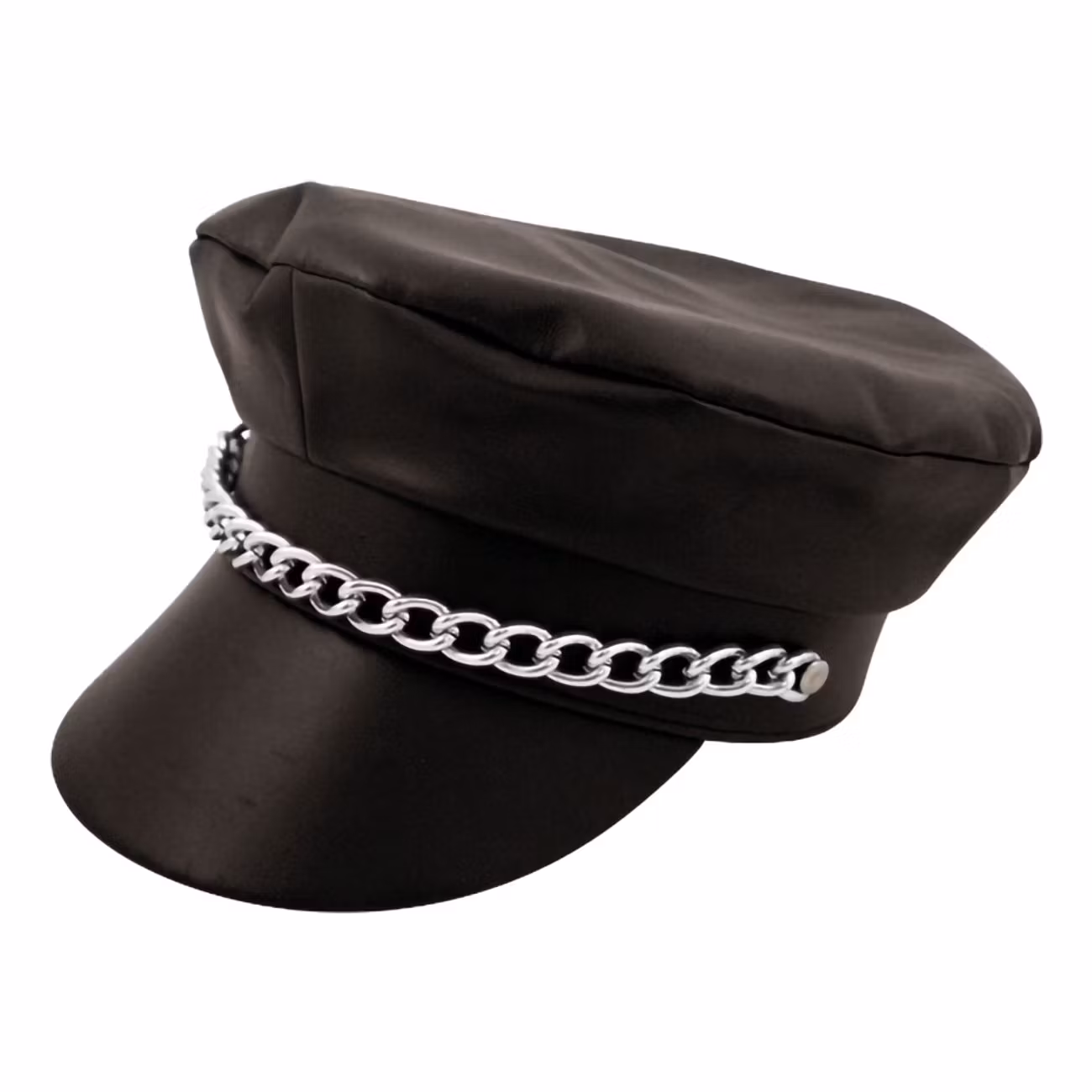 Keps Svart med Kedja är en svart keps i skinnimitation med skärm och silverfärgad kedja framtill. Perfekt huvudbonad till temafesten.
