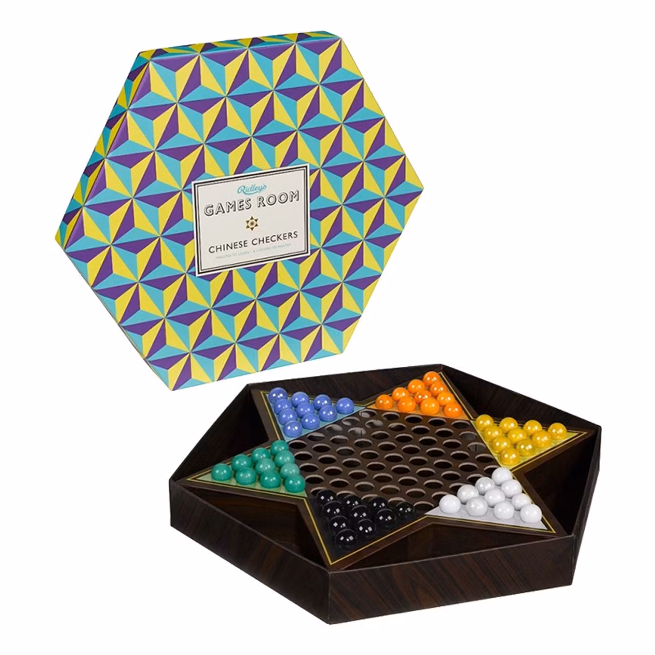 Kinaschack med spelpjäser av glas i sex olika färger - gul, vit, svart, grön, orange och blå. Spelplanen är formad som en stjärna och boxen som en hexagon. Förpackningen kommer i ett modernt mönster i färgerna blått, turkost och gult.