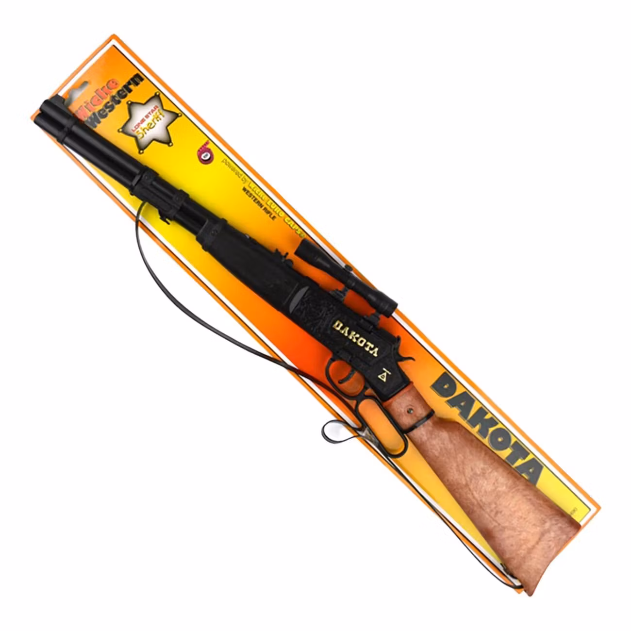 Knallpulvergevär Dakota 100-skotts är ett svart och brunt gevär med kikarsikte. Geväret är tillverkad i plast och det är 64 cm långt. Köp gärna till 100-skotts knallpulver. Var försiktig och skydda ögon och öron.