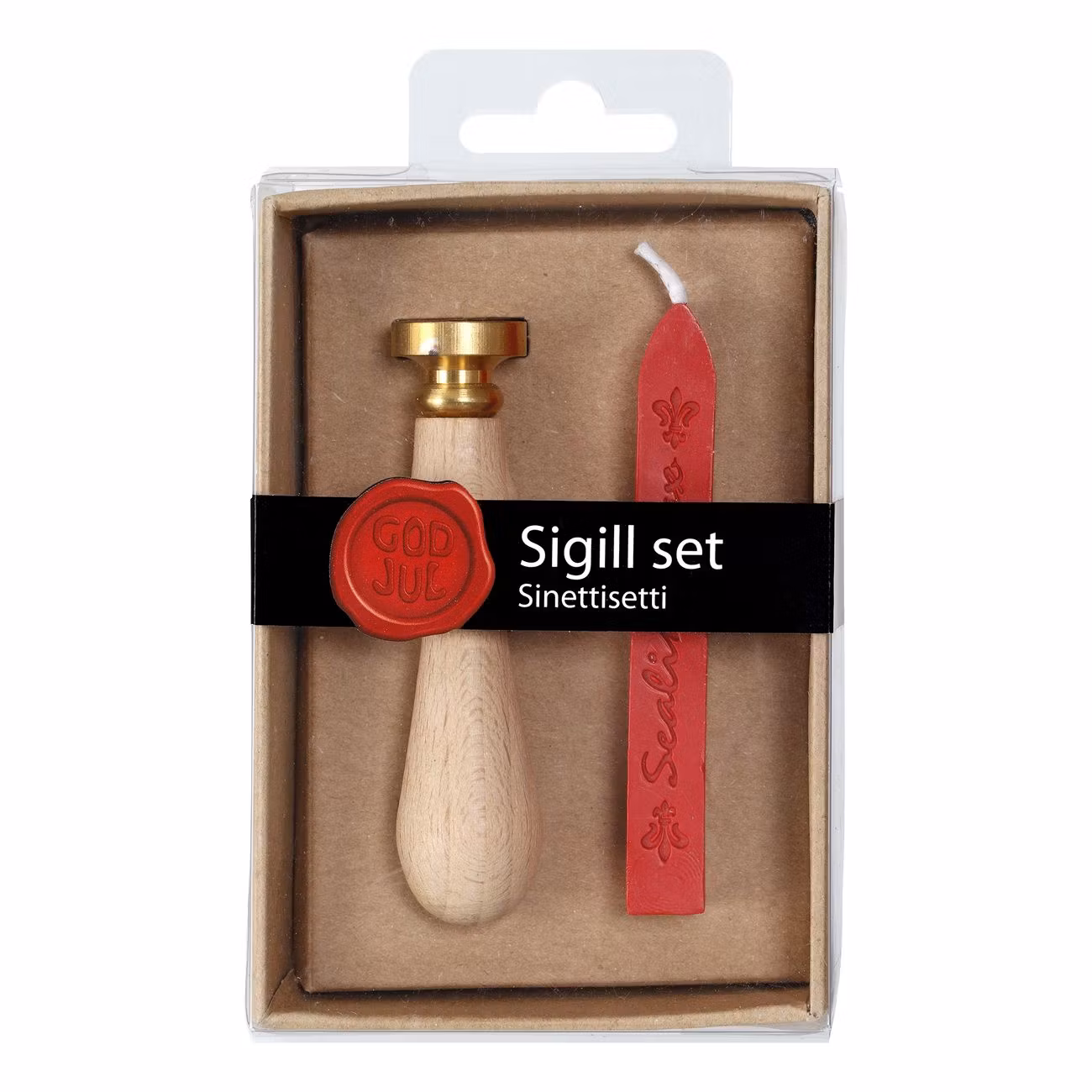 Lacksigill Set God Jul inkluderar en fin stämpel av trämaterial med texten "God Jul" samt en röd lackstång. Så bara att tända lackstången och låta det droppa där du önskar, och sedan stämpla - resultatet blir otroligt vackert!