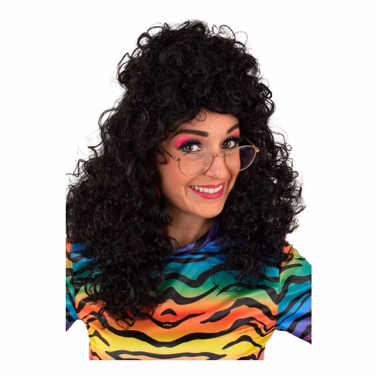 Släng på denna långa svarta peruk på huvudet när du planerat att klä ut dig till en rockstjärna eller en 80-tals discodiva. Peruken är lång, lockig, svart och sitter skönt på huvudet hela kvällen lång. Frisyren passar till alla sorters maskeraddräkter.