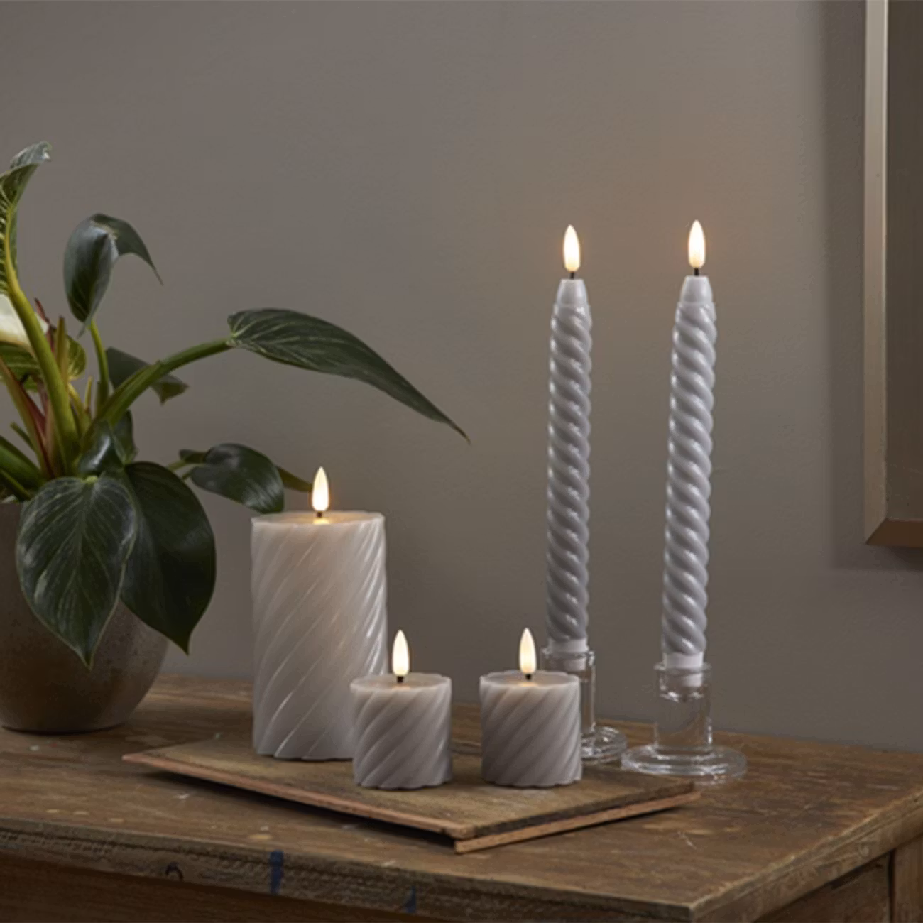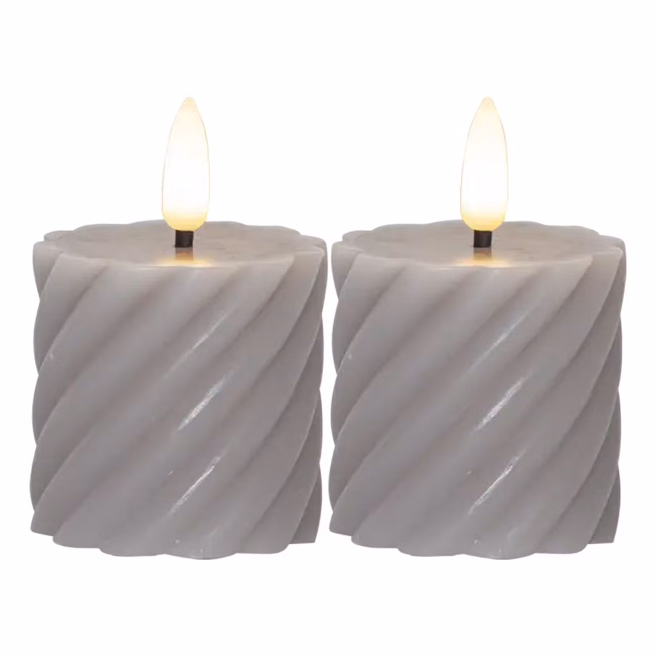 LED Blockljus Twist Grå inkluderar två par ljus i en härligt beige färg och en naturtrogen låga med varmvitt sken. Ljusen har även en inbyggd timer.