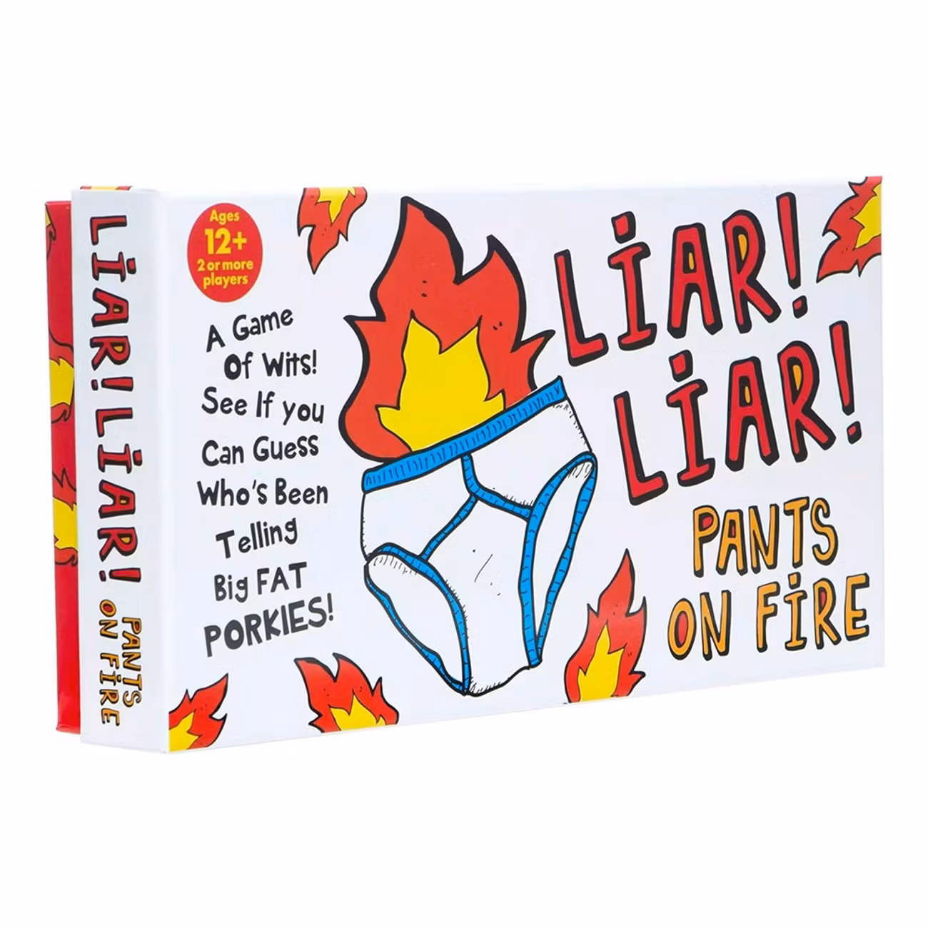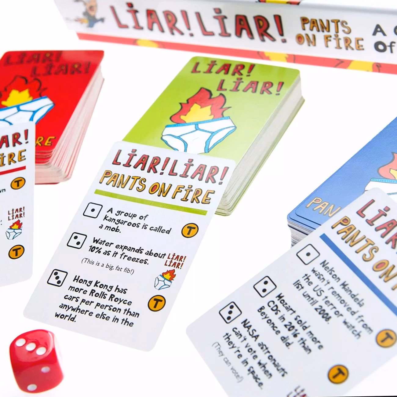 Liar Liar Pants On Fire Sällskapsspel går ut på att övertyga dina motståndare om att du talar sanning. Rulla tärningen för att välja ett fakta from kortet och läs. Din motståndares uppgift är att syna bluffen – eller bekräfta sanntingen. Ett superkul spel för stora som små!