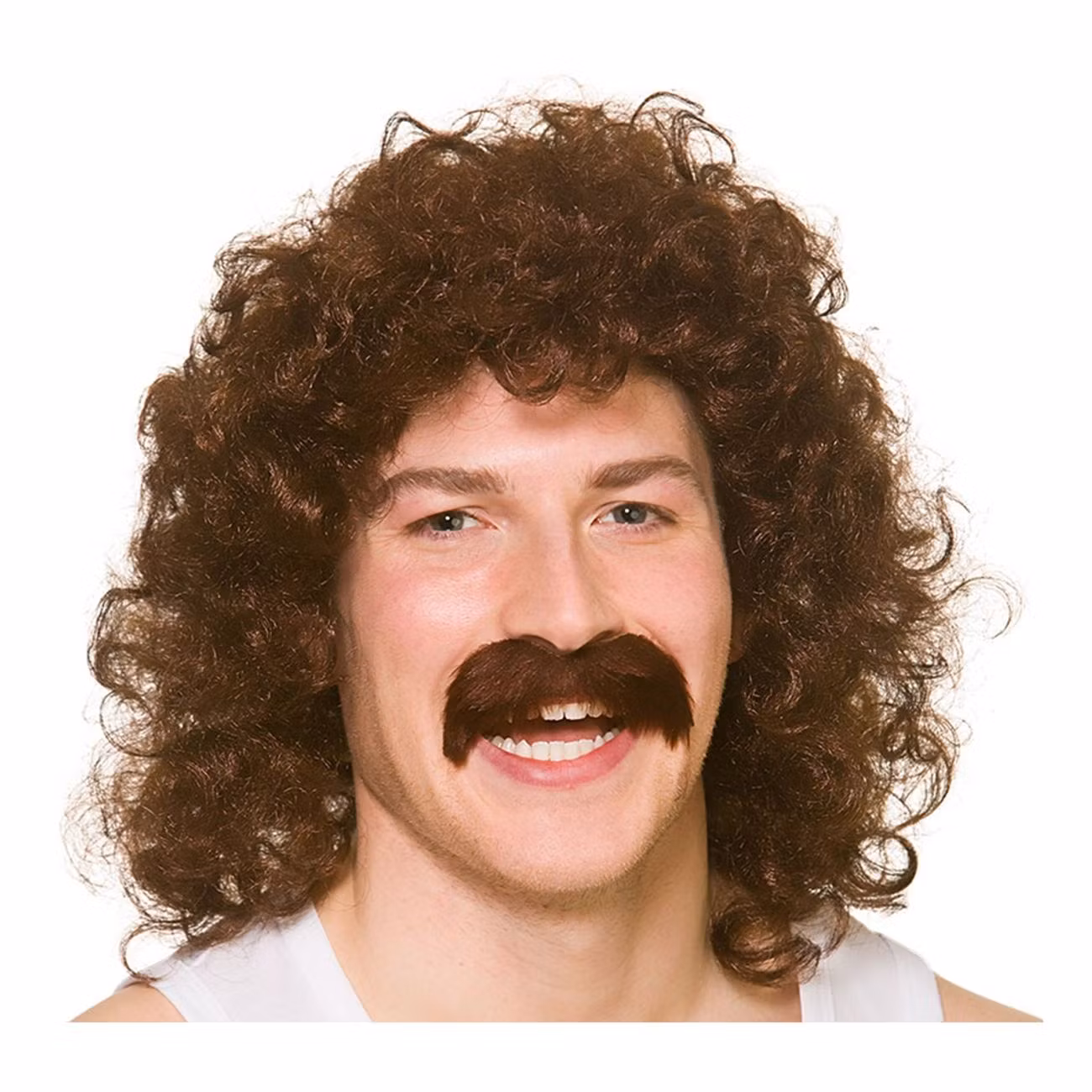 Lockig 80-talskille Brun Perukset består av en peruk och mustasch i brunt. Håret är lockigt och går ner en bit över axlarna. Komplettera med peruknät för extra hållbarhet.