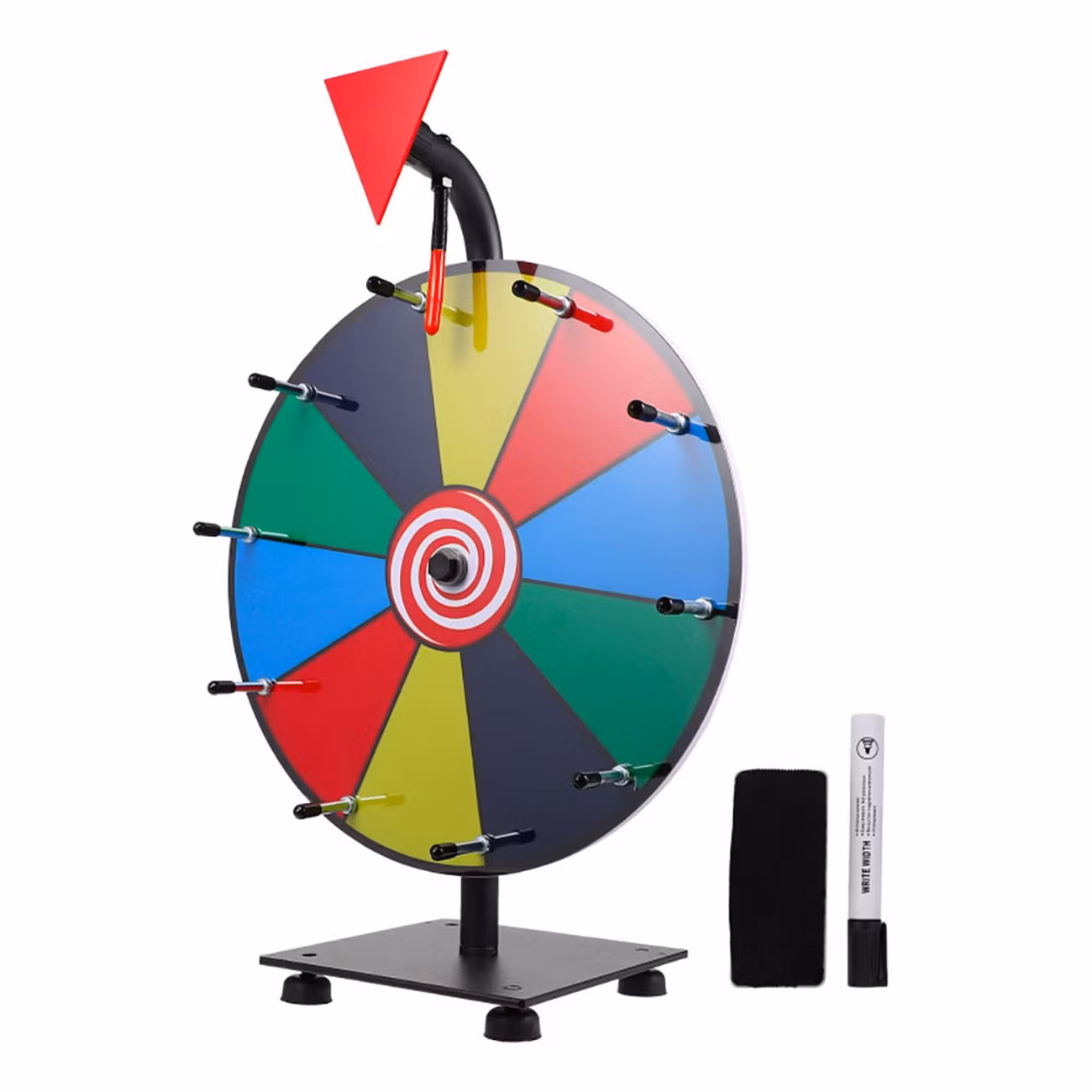 Lyckohjul Kit inkluderar ett prishjul med tillbehör att använda som spel eller en rolig leksak. Använd helt enkelt den medföljande pennan för skriva olika utfall på hjulet, snurra, och håll tummarna. Perfekt att använda som ett roligt festspel!