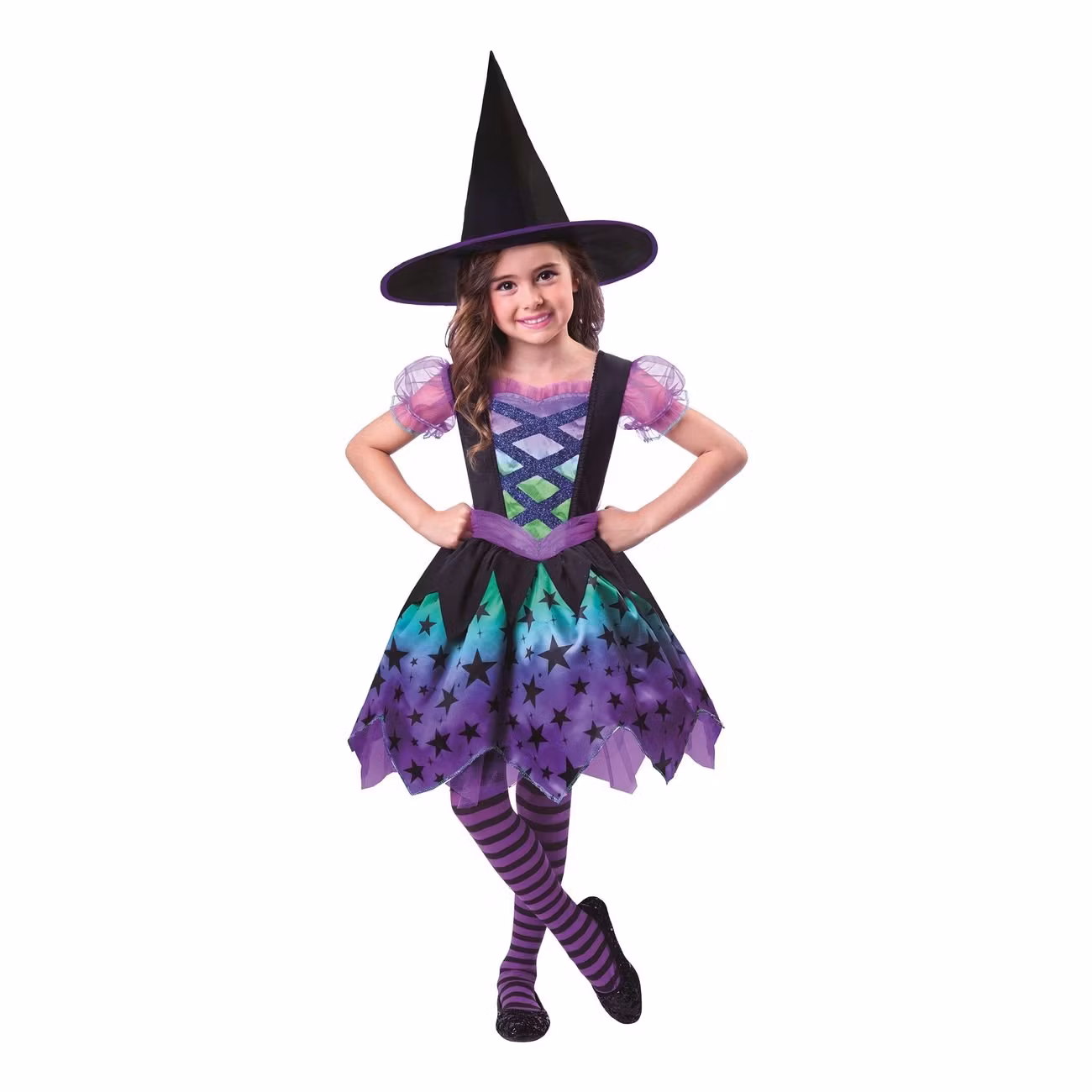 Magisk Häxa Klänning Barn Maskeraddräkt inkluderar en flerfärgad, skimrande häxklänning med svarta stjärnor och söta puffärmar i rosa spets. Ingår gör en matchande häxhatt. Strumpbyxor och skor ingår ej. En ypperlig utklädnad som passar både en påskhäxa eller en häxa på halloweenkalaset!