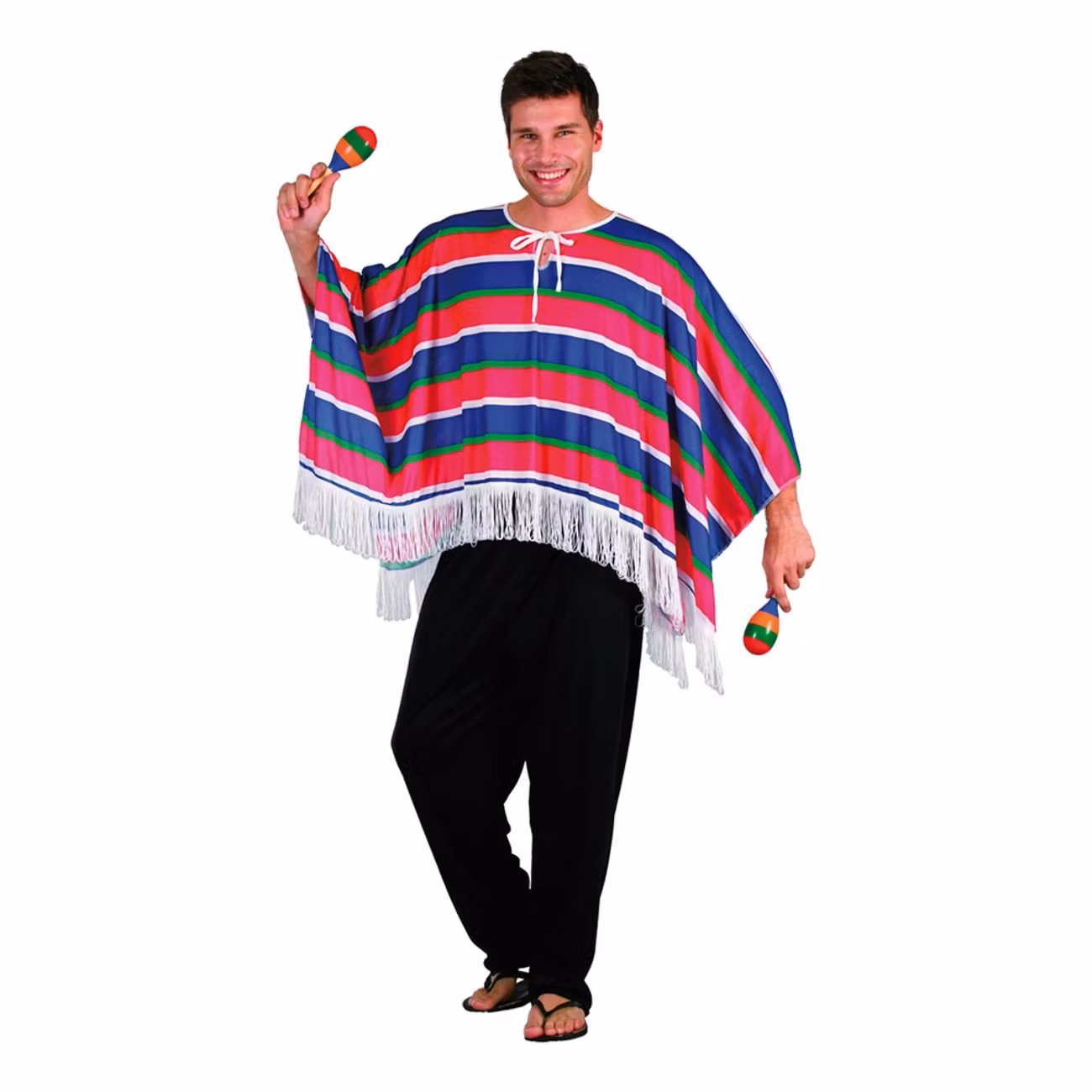 Ett billigt och enkelt sätt att sätt att smälta in på den mexikanska festen! Mexikansk Kille Maskeraddräkt inkluderar en randig poncho med knytning runt halsen och strängade kanter. Finns i storlek:
