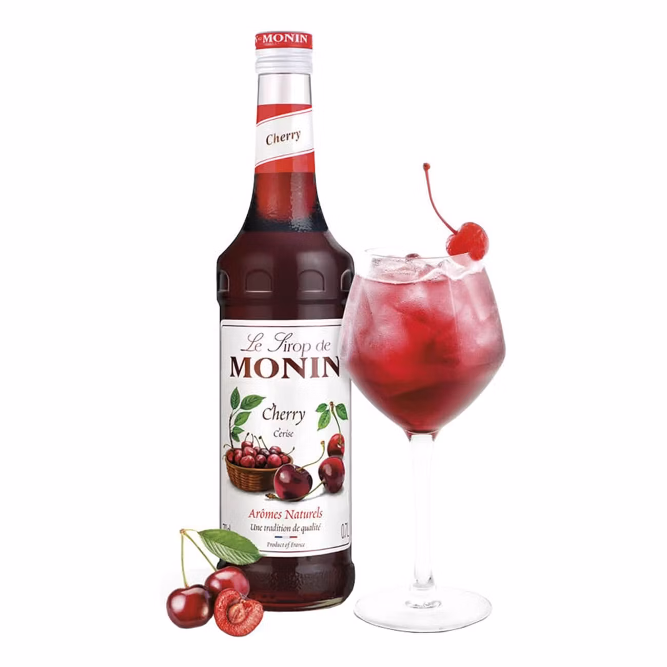 Monin Cherry Syrup är en drinksirap med smak av körsbär. Levereras i flaska om 70 cl. Öppnad flaska håller sig i tre månader.