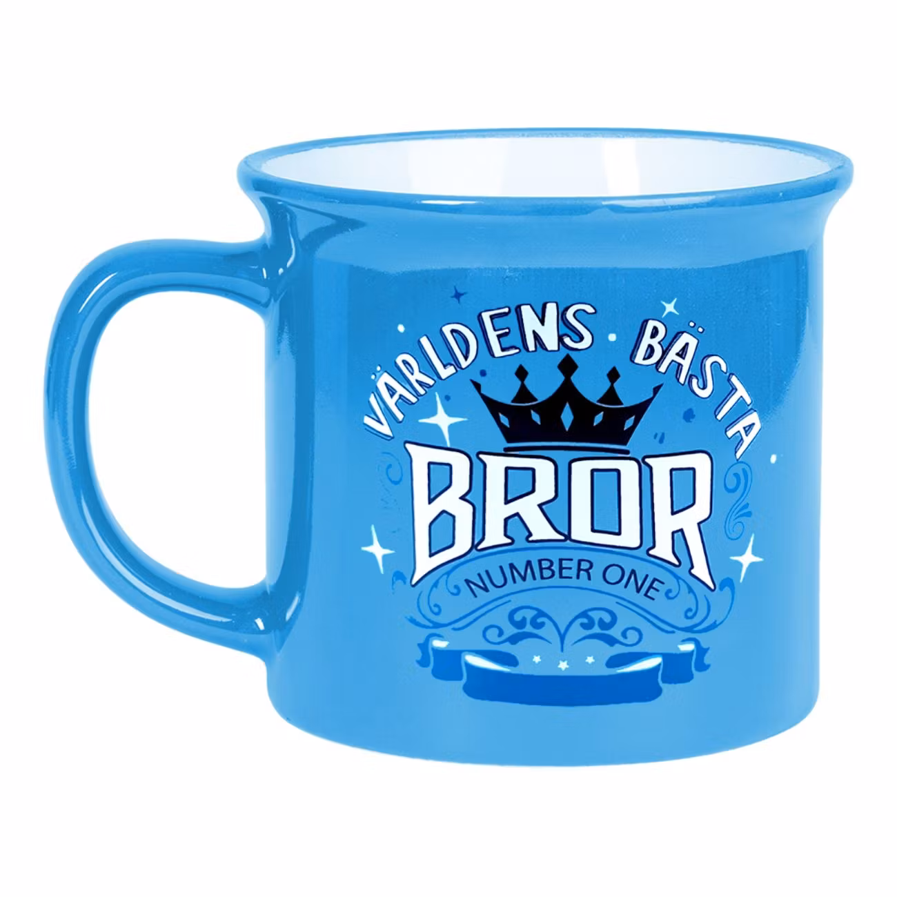 Mugg Bror är en blå porslinsmugg som kommer med texten “Världens bästa bror - number one”. Perfekt att ge bort som en omtänksam present till din bror!