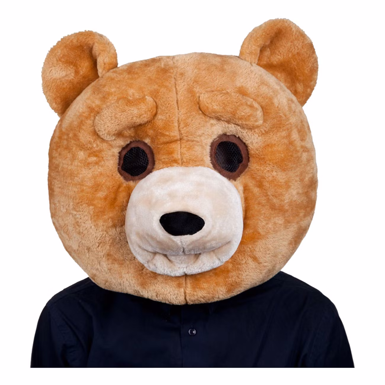 Nallemask med Stort Huvud är en luddig maskot-mask som är riktigt stor och täcker hela huvudet. Den har brun luddig päls och ljusbeige nosparti. Ögonen är helt svarta. Den svarta tröjan ingår ej.