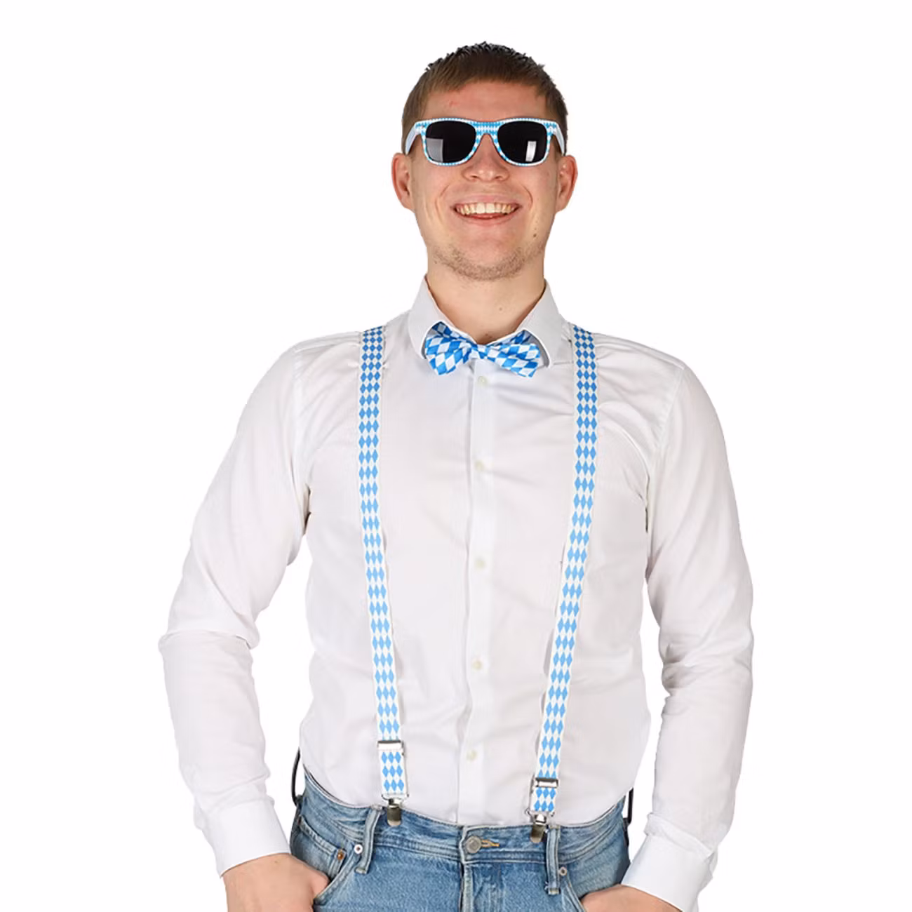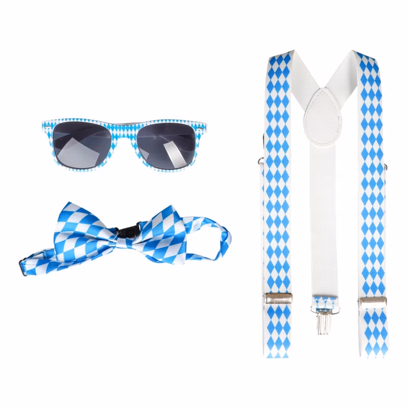 Oktoberfest Tillbehörskit består av ett par hängslen, en fluga och ett par solglasögon i matchande blå- och vitrutigt mönster. Hängslena är elastiska och justerbara, och kommer med metallclips.
