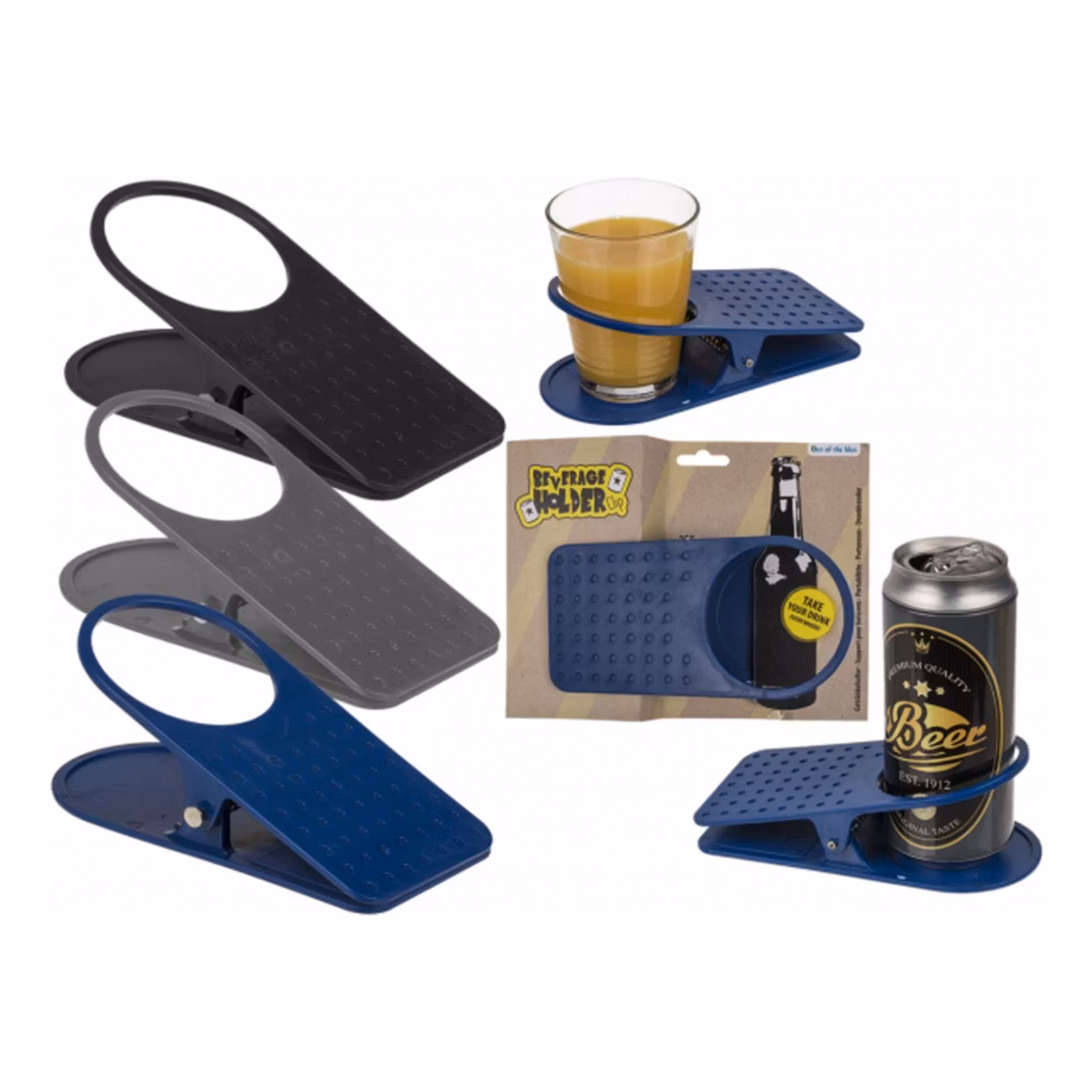 Nu behöver du aldrig igen ställa ölen på golvet och riskera att någon välter den. Knipsa fast denna ölhållare på balkongräcket, det överfyllda soffbordet, bokhyllan eller strandstolen. Var helst det finns något att knipsa fast i kan det nu också finnas en öl!