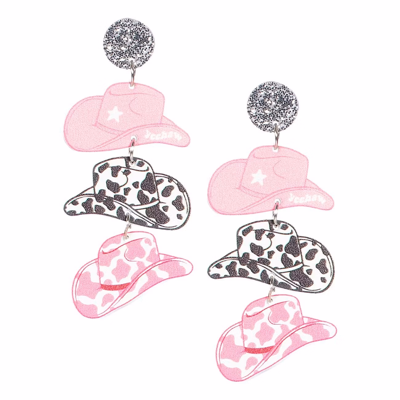 Örhängen med Cowboyhattar inkluderar ett par festliga örhängen som består av tre små cowboyhattar som hänger i rad. Den översta hatten är rosa med vit stjärna och texten Yeehaw på sidan. I mitten hänger en hatt med svartvitt koskinnsmönster, och längst ner sitter en hatt i rosa och vitt koskinnsmönster.