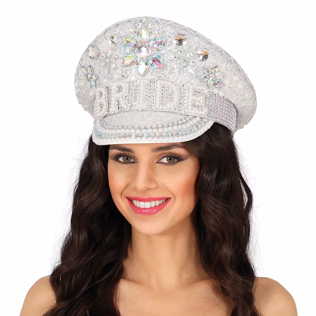 Paljettkeps Bride med Pärlor är en vit keps täckt med skimrande silverpaljetter och är dekorerad med stora färgskimrande pärlor, kristallblommor, glittrande strassband runtom och ordet "BRIDE" av glittriga små vita pärlor.