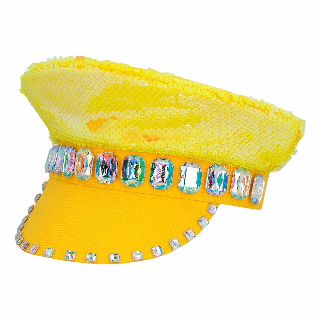 Dags att glittra som solen själv! Med den här knallgula paljettkepsen på huvudet är du redo att stjäla showen - oavsett om det är på festivalen, prideparaden eller när du struttar fram i vardagen som om den vore ett dansgolv.