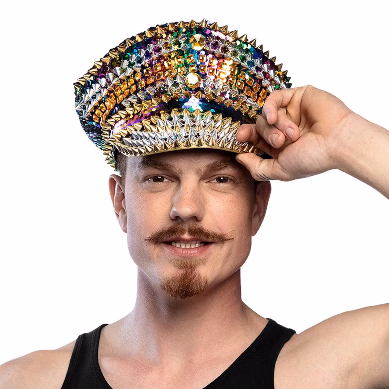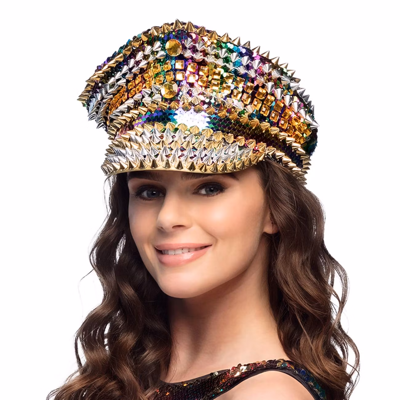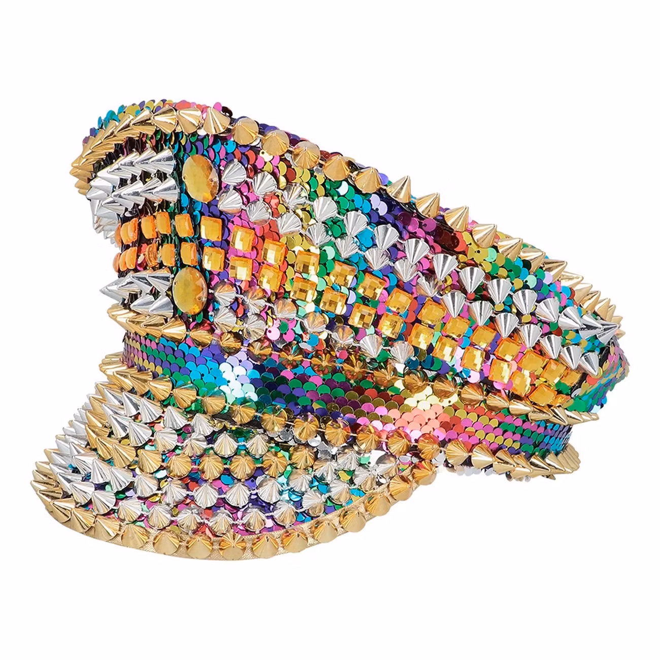 Paljettkeps med Nitar Regnbågsfärgad är en skimrande festivalkeps med regnbågsfärgade paljetter och massor av nitar i både guld och silver. Perfekt festivalhatt till Pride, festivalen eller ravepartyt när det är all-in som gäller.