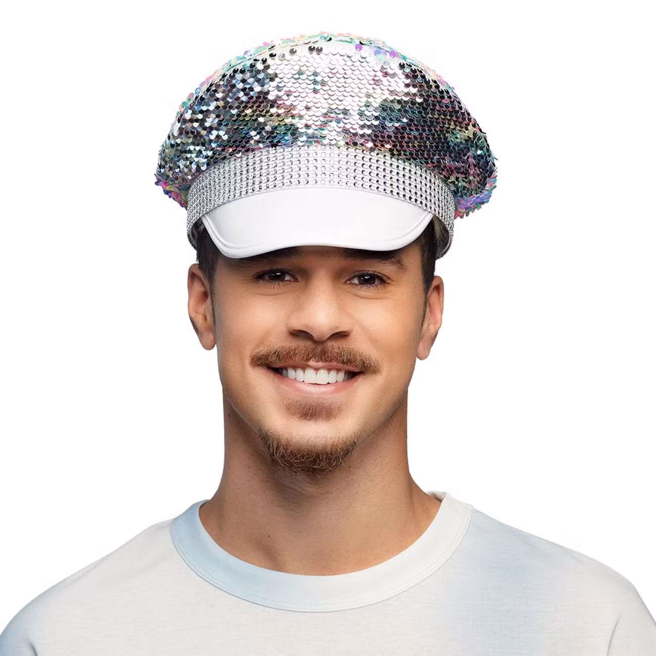 Paljettkeps Tvåfärgad Silver/Regnbåge är en vit keps dekorerad med tvåfärgade vändbara paljetter; regnbågsfärgade och silver. Runt kepsen finns även ett brett strassband som gör den extra glittrig.
