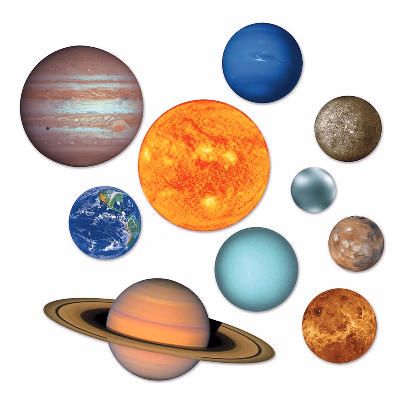 Pappersdekorationer Solsystemet inkluderar tio stycken runda pappskivor som föreställer solsystemets planeter. Planeterna har olika färger och varierande storlekar.