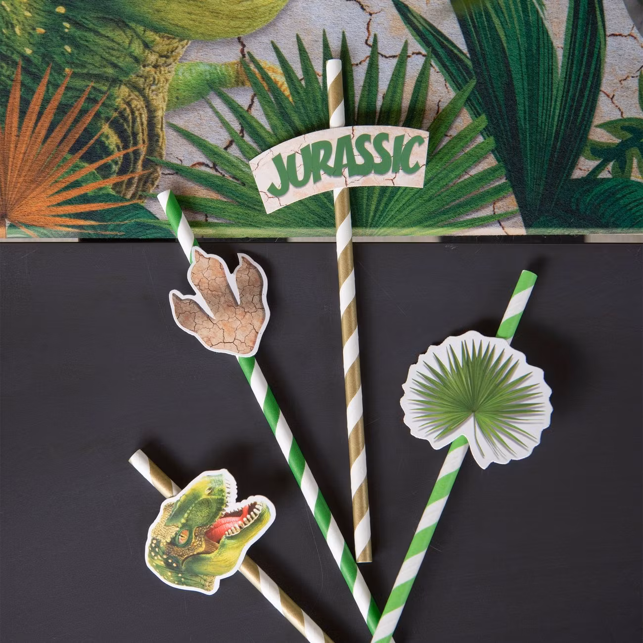 Papperssugrör Dinosaurie inkluderar åtta randiga sugrör i grönt eller brunt. Varje sugrör också dekorerad med ett märke som föreställer ett dinosaurietema, ett fotavtryck efter en dinosaurie, ett grönt blad eller en skylt som det står ”Jurassic” på. Det är bara sugrören som ingår, inget annat som syns på bilden.