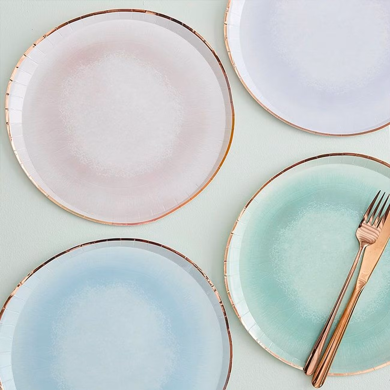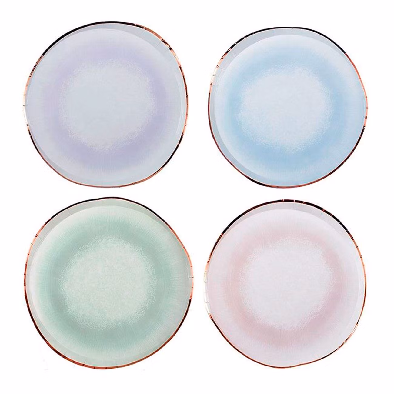 Här var det pastell för hela slanten! Åtta urtjusiga tallrikar i papper som alla pryds av en elegant roséguldkant. Perfekt när det vankas festligheter som kräver lite mer än tråkiga papperstallrikar i helvitt.